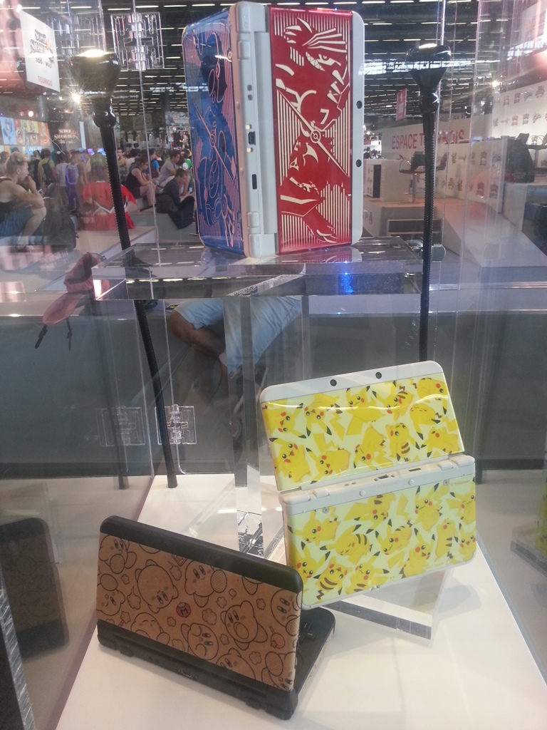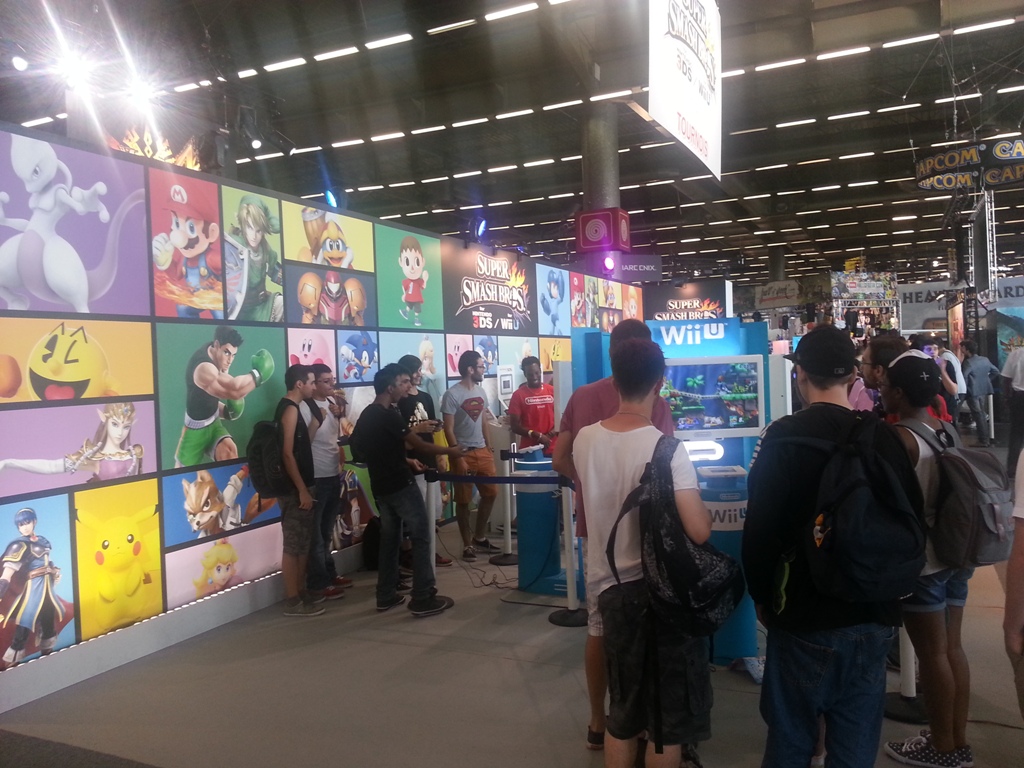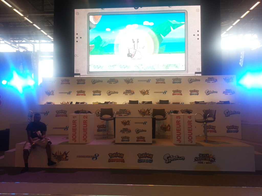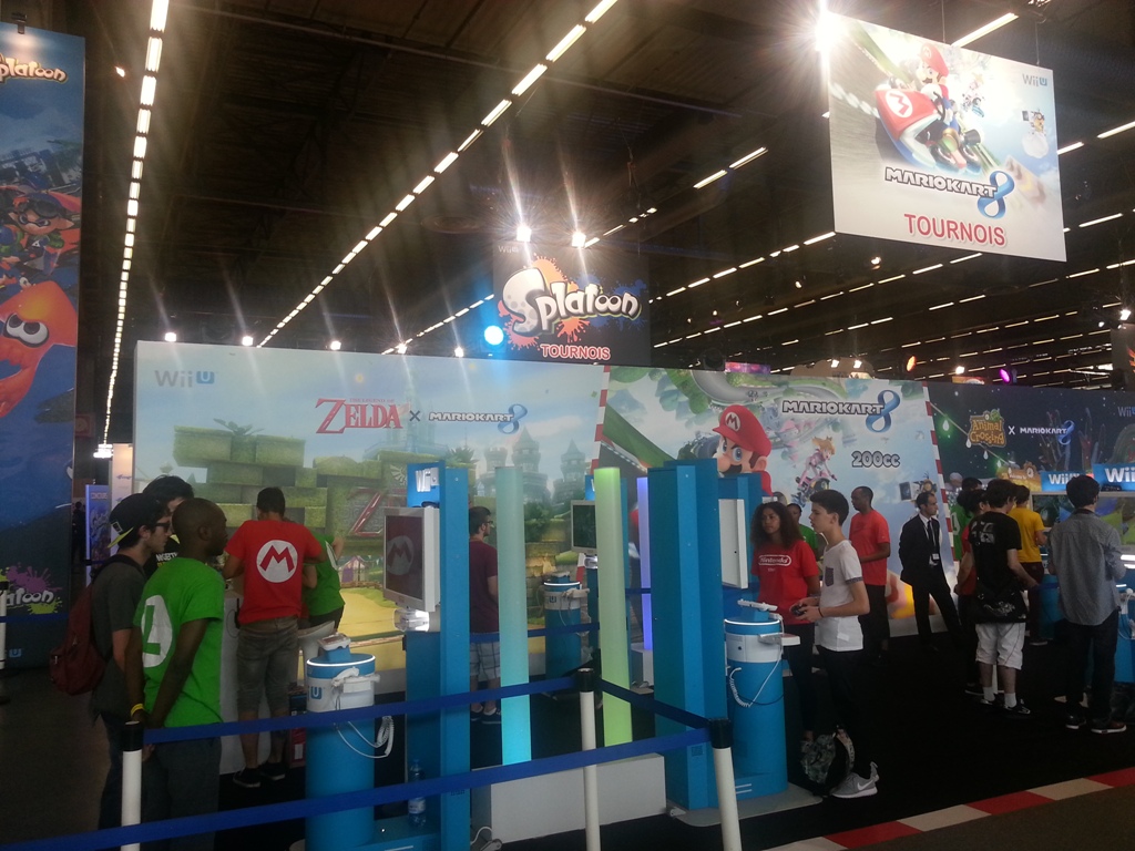 9h07: Après avoir contemplé ma future caisse la Batmobile de Arkham Knight à taille réelle, je file tout droit vers le stand Nintendo à 2 pas de là, plus animé que jamais. Quelques Amiibos (déjà en vente pour la plupart) ainsi que des coques pour New3DS étaient exposés en vitrine pour les plus curieux. La grande scène du stand comme à son habitude, se tenait prête à accueillir un des nombreux tournois Nintendo (Smash Bros, Mario Kart 8, Pokémon), eux-mêmes retransmis sur la chaîne Twitch de Nintendo France.
