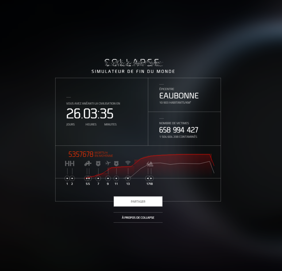 Si vous-vous êtes déjà demandé à quelle vitesse une pandémie peut se répandre, et quelles conséquences aurait-elle sur nôtre civilisation, alors Collapse (Effondrement en Anglais), simulateur de crise virtuelle made-in Ubisoft pour la promotion du jeu Tom Clancy’s : The Division prévu pour le 8 Mars 2016, pourrait répondre à cette interrogation. C’est à peu de choses près le même topo que Plague-Inc pour ceux qui connaissent.