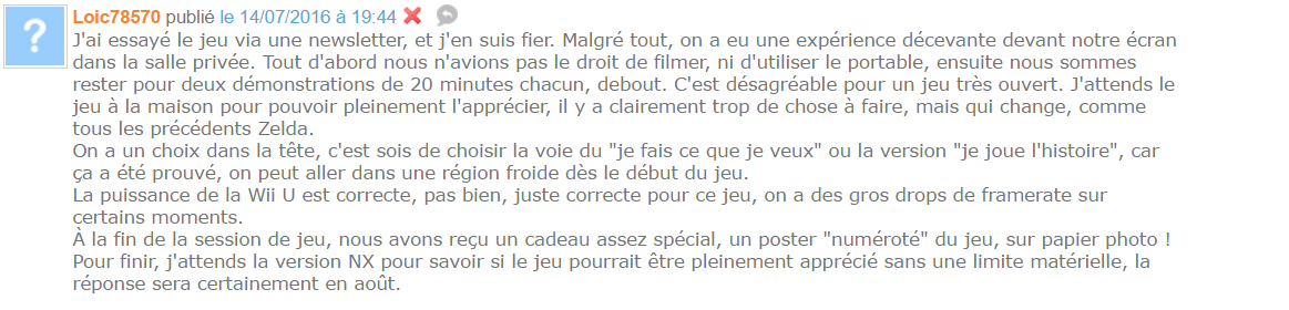 Pourtant, The Legend of Zelda : Breath of The Wild était là-bas. Mais jouable au salon sous certaines conditions. En plus du concours cosplay cité plus haut, il fallait soit réaliser son plus beau fanart Zelda, soit répondre correctement à un Quizz sur la série. J’ai tenté ce dernier mais je n’ai jamais eu de réponse 😦