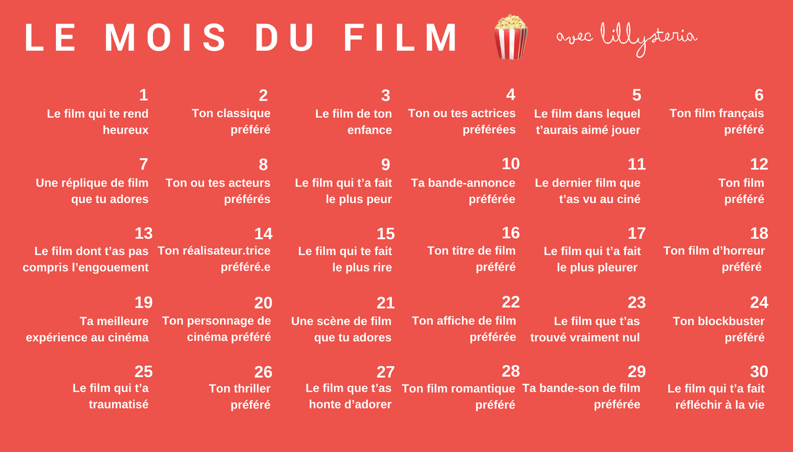Sur Facebook, j’avais relevé le défi de poster une image de film par jour pendant 1 mois, en prenant en compte les critères de l’image ci-dessous.
