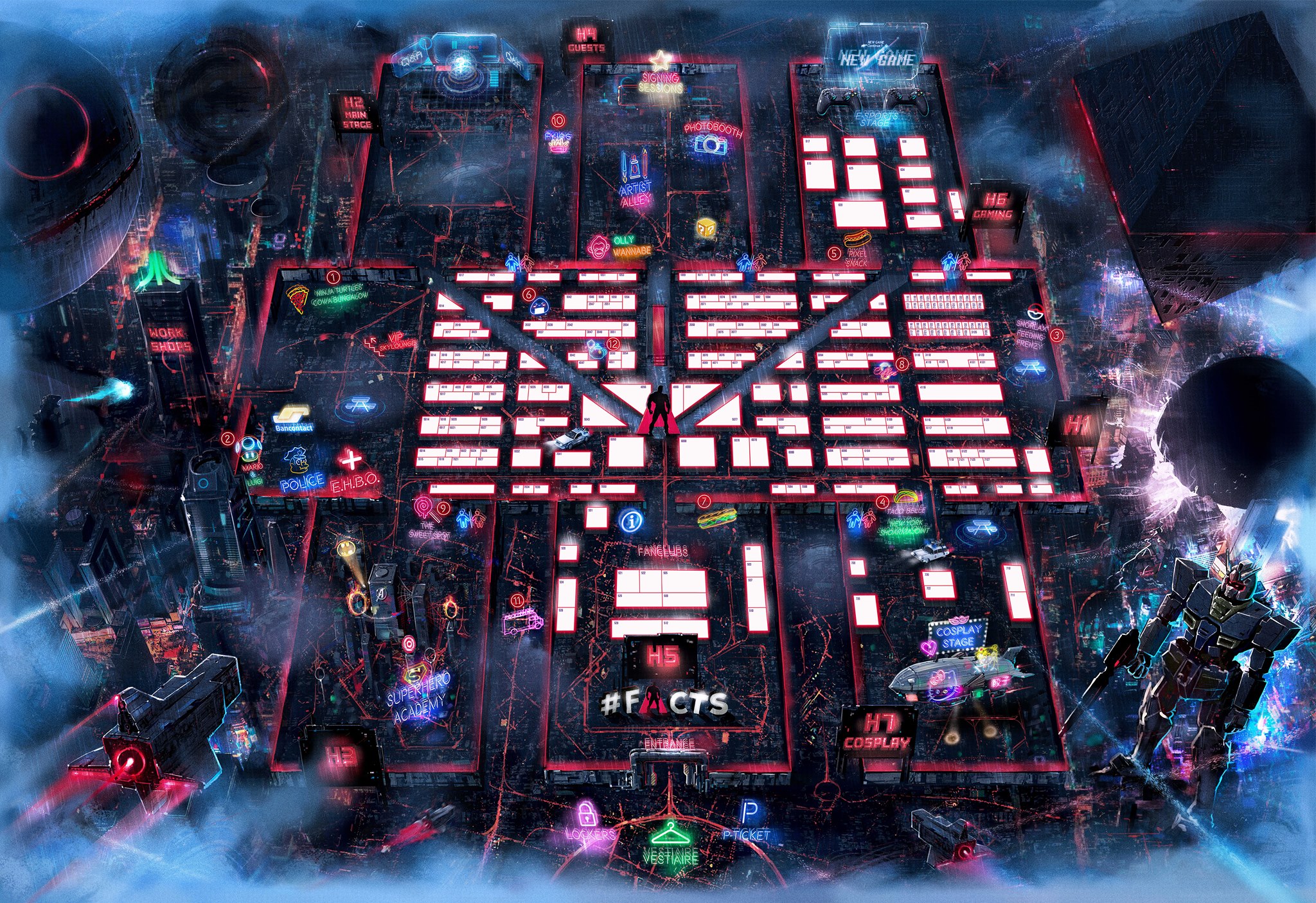 7 Halls couvrant superficie totale de 40.000m² ont été mis à disposition au sein du Flanders Expo qui fut renommé « Vaisseau Mère » pour l’occasion. Un nom qui lui va plutôt bien si j’en crois l’apparence très science-fiction du plan du salon ci-dessus. Plan que l’on peut retrouver sur ce flyer interactif ci-dessous, qui est la version numérisée de celui distribué aux visiteurs.