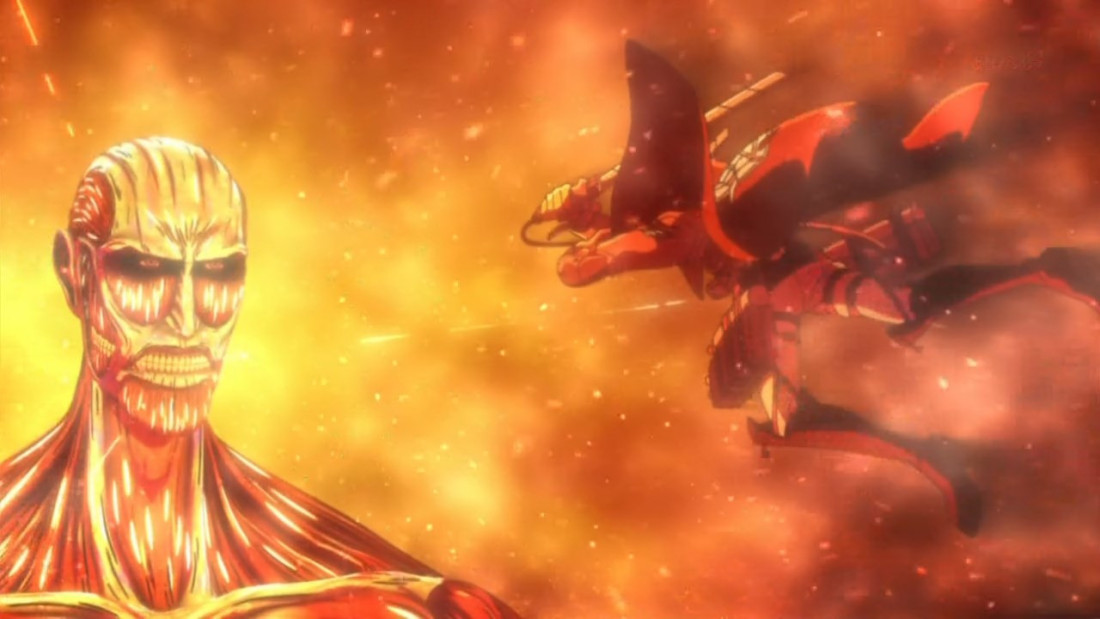Pour la seconde partie de cette saison 3 qui pour moi tutoyait la perfection à tous les étages, ce fut un retour aux sources dans le sens le plus littéral qui soit. D’abord un retour dans la ville désormais fantôme de Shiganshina. Là où l’histoire même de la série a débuté 5 ans avant la trame actuelle. Et aussi le retour des titans emblématiques avec le Cuirassé et le Colossal qui avaient ravagé ce même district à l’époque. Et qui sont à nouveau présents sur les lieux pour finir le boulot. Un clin d’œil m’a fait remémorer les excellents souvenirs de la toute première saison sortie il y a déjà 6 ans. La boucle était presque bouclée à ce moment-là.