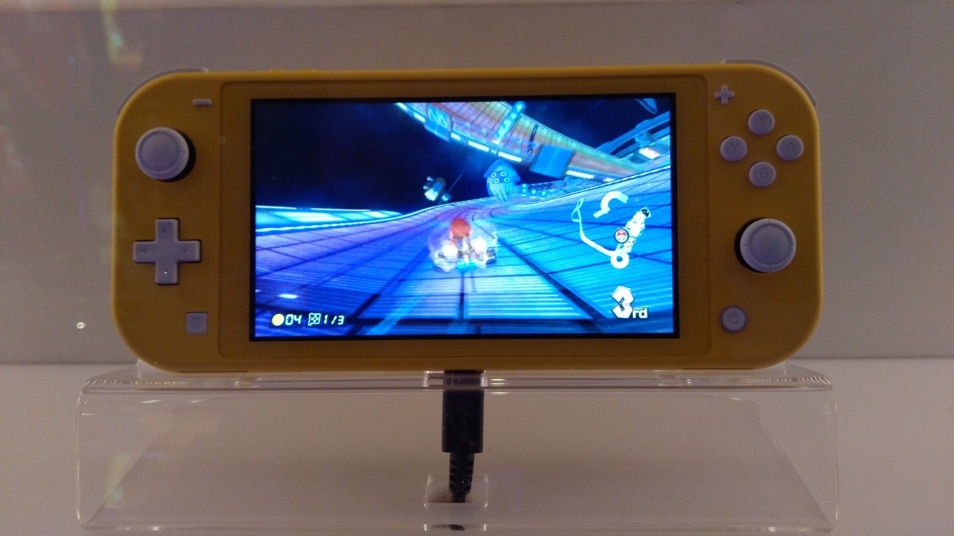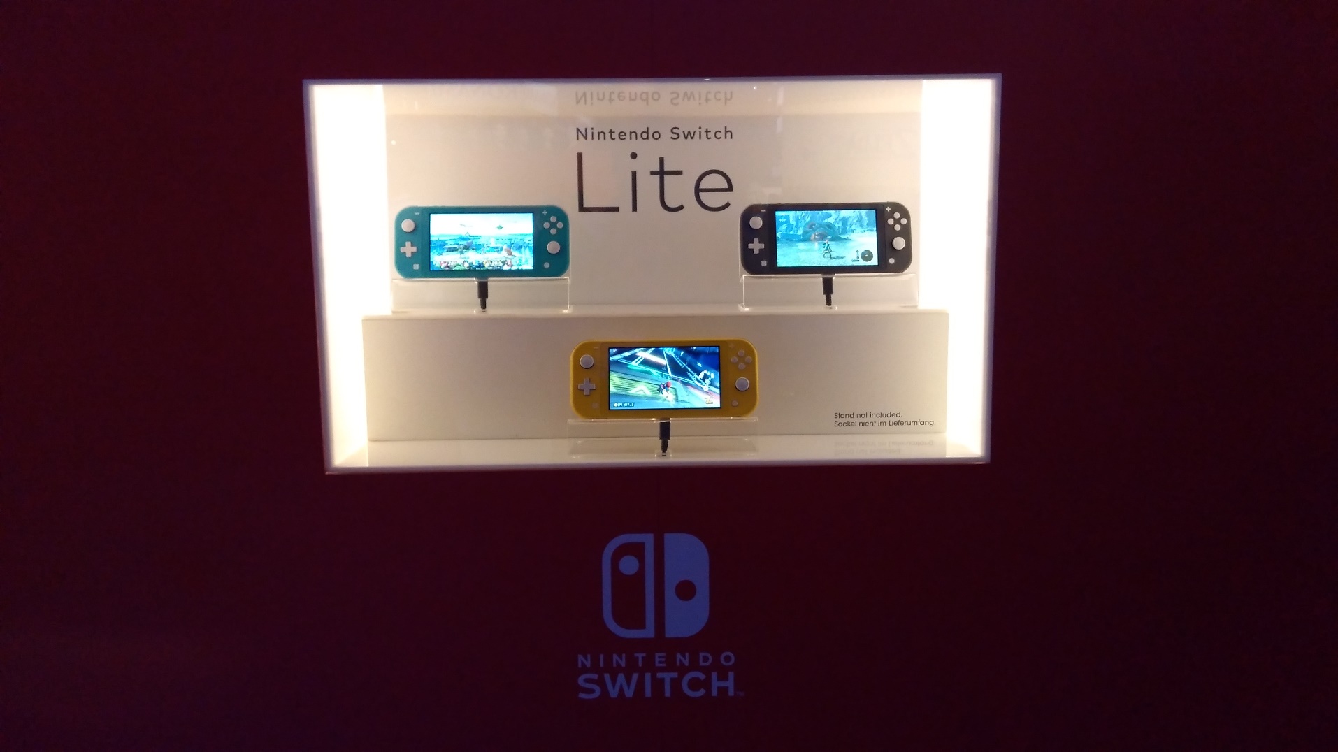 J’ai pu voir de près la Switch Lite qui sort la semaine prochaine. Non testable sur place mais exposée en vitrine à la vue de tous.