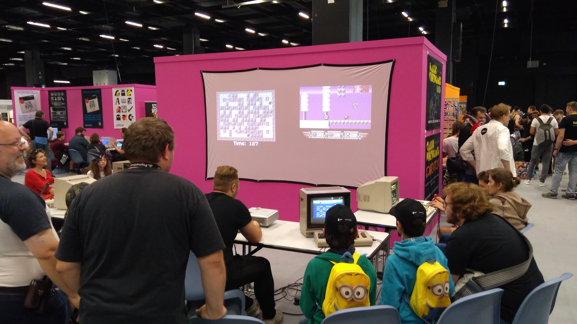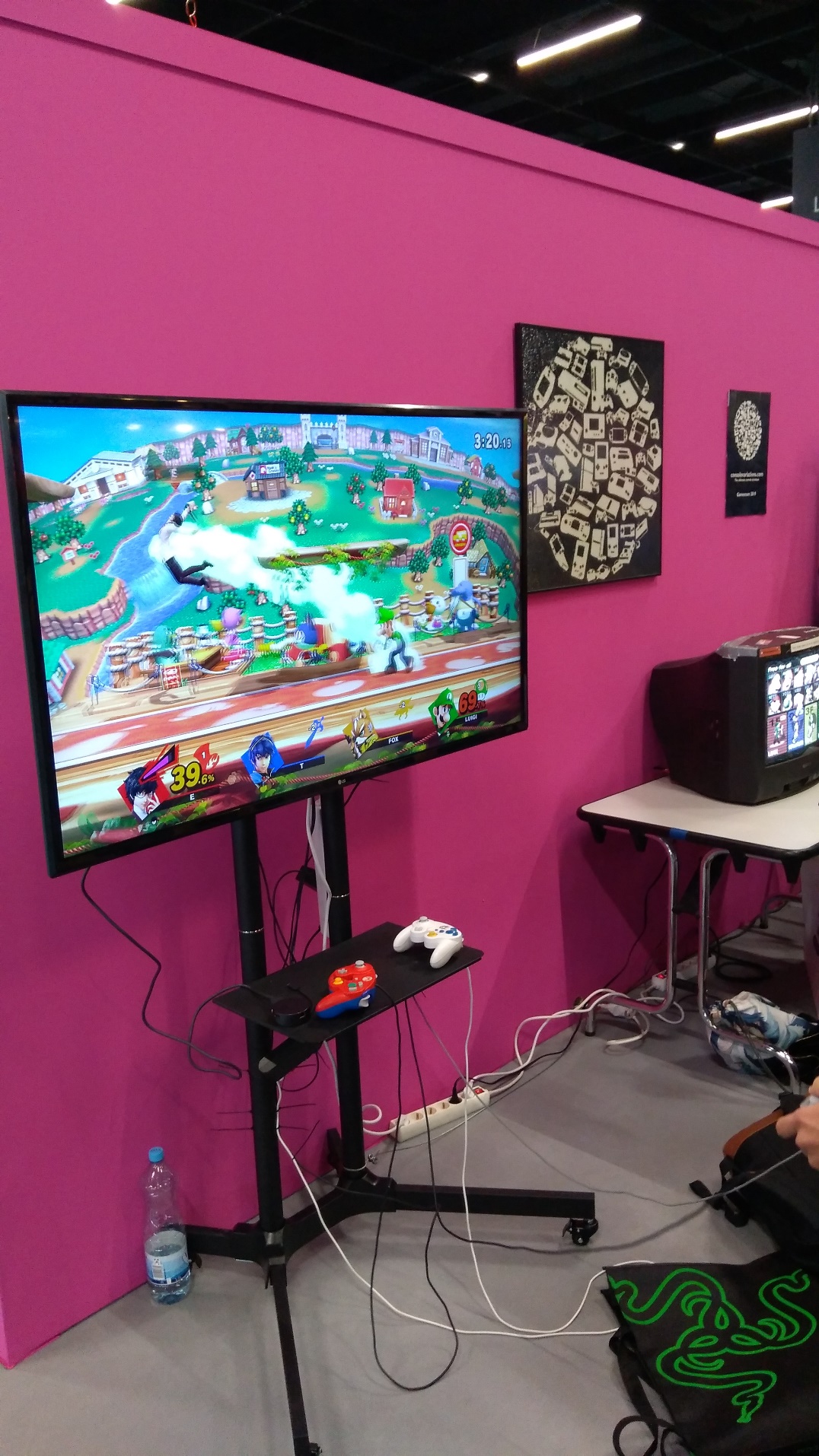 Quand le passé (Bomberman à gauche) côtoie le présent (Smash Ultimate à droite) avec les jeux de la zone rétro de l’étage supérieur de l’éclectique Hall 10.