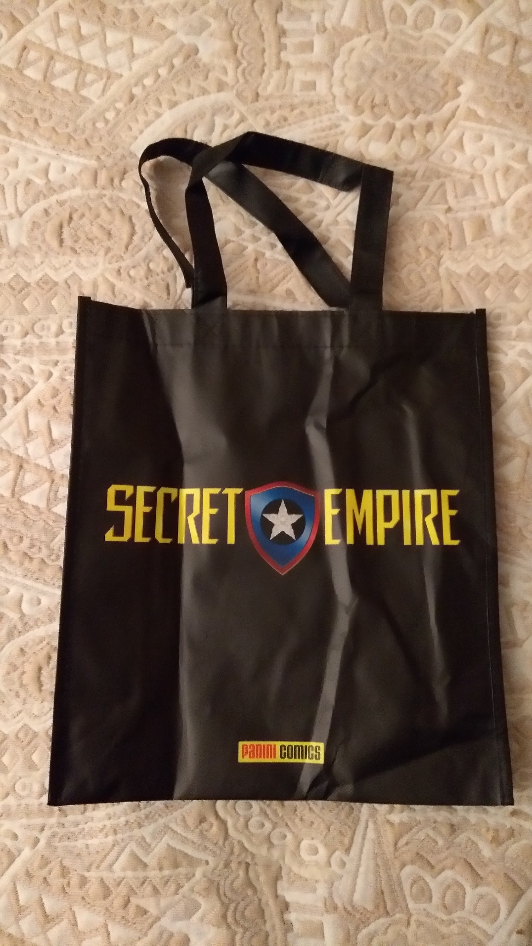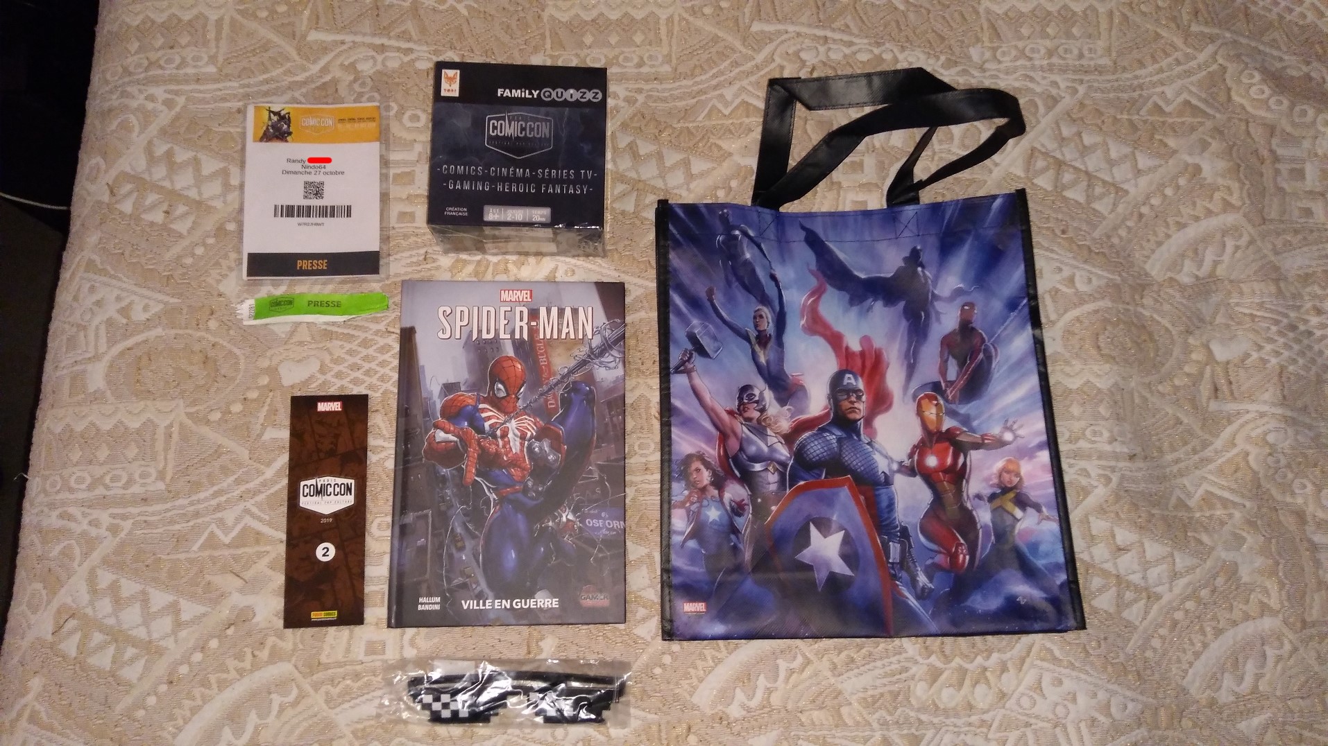 En plus de mon badge accréditation Presse, le pactole de cette année fut relativement léger avec le comics Spider-Man : Ville en guerre par Dennis Hallum dont j’ai parlé plus haut. Et offert avec un petit sac « Secret Empire » et un marque-page recto-verso. Un jeu quizz de la Comic Con. Et des lunettes « thug-life ». Mon seul regret étant de ne pas avoir pu chopper les gros sacs des 80 ans de Marvel offerts aux premiers visiteurs arrivés sur place..