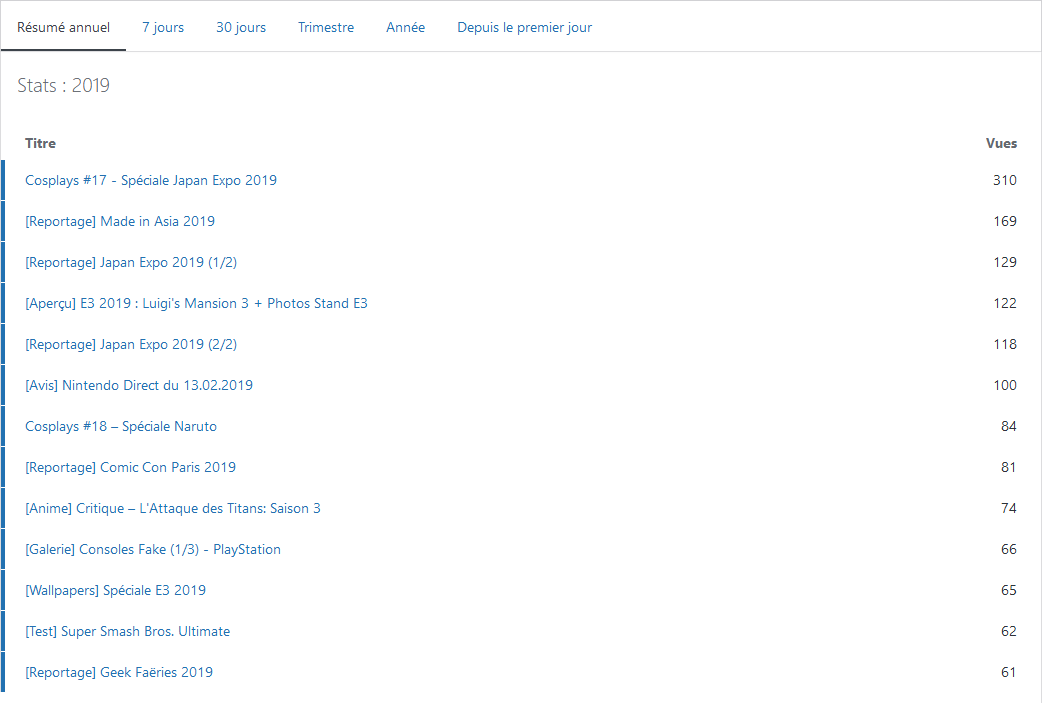 Mais au-delà des chiffres que je dois en très grande partie aux sites référents tels que Facebook, Twitter et Gamekyo où je reposte / partage mes articles, l’intérêt là-dedans est de voir quel type d’article a le plus de visibilité. Et je trouve ça rassurant car je sais que mes écrits ont une certaine portée et que je ne le fais pas dans le « vent » finalement.