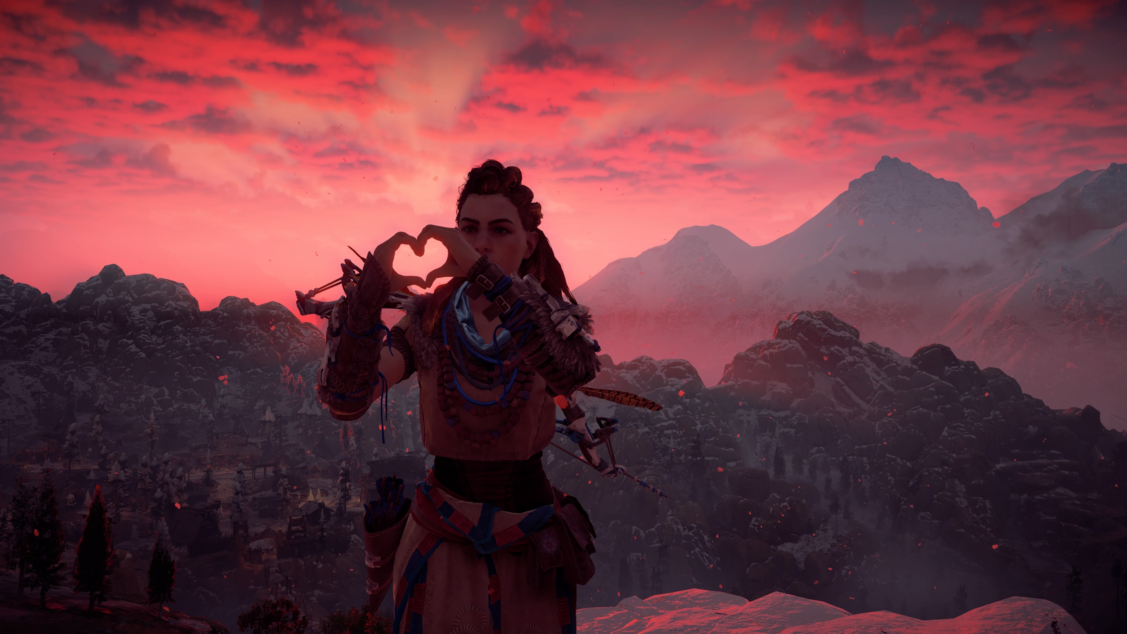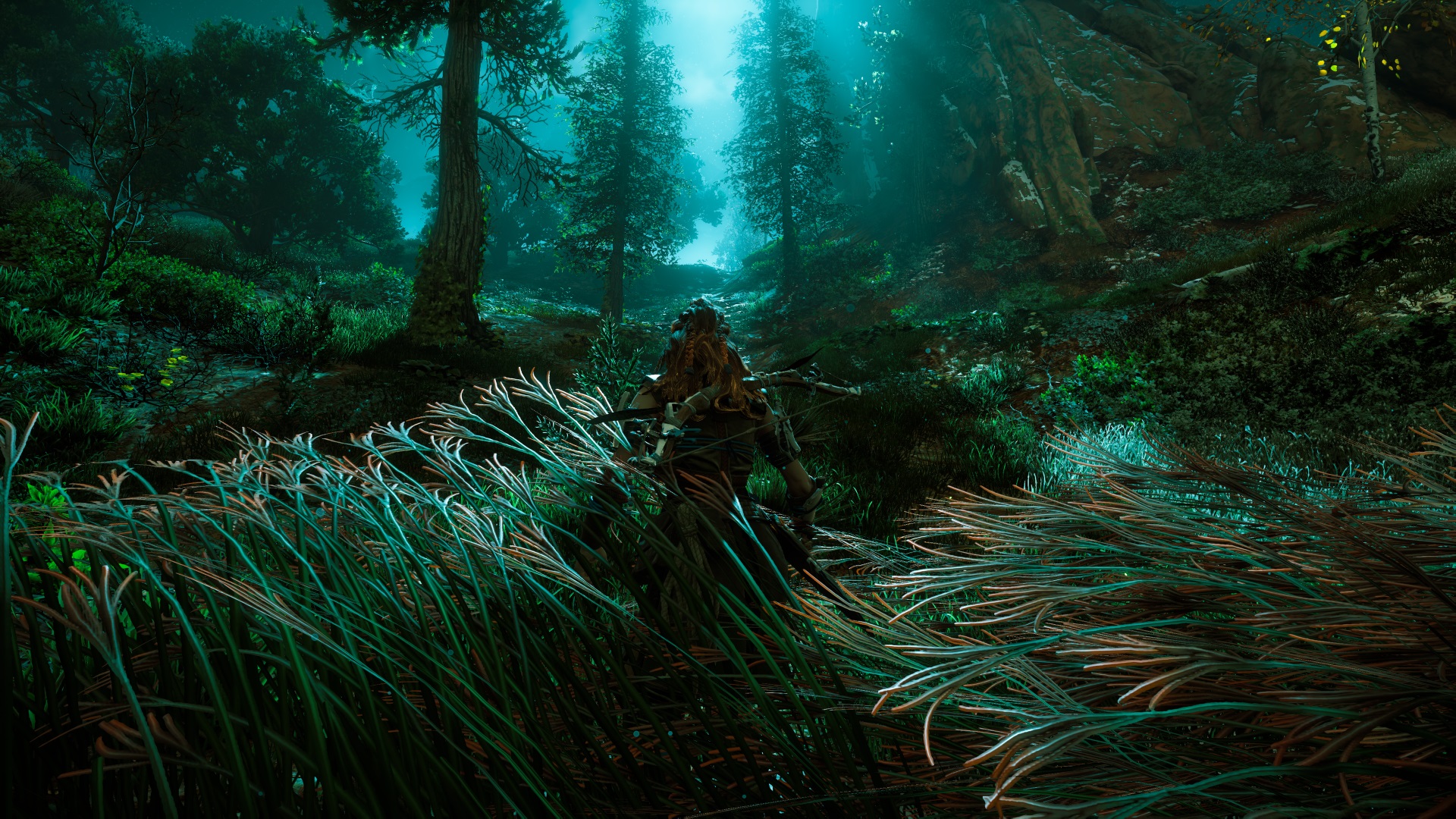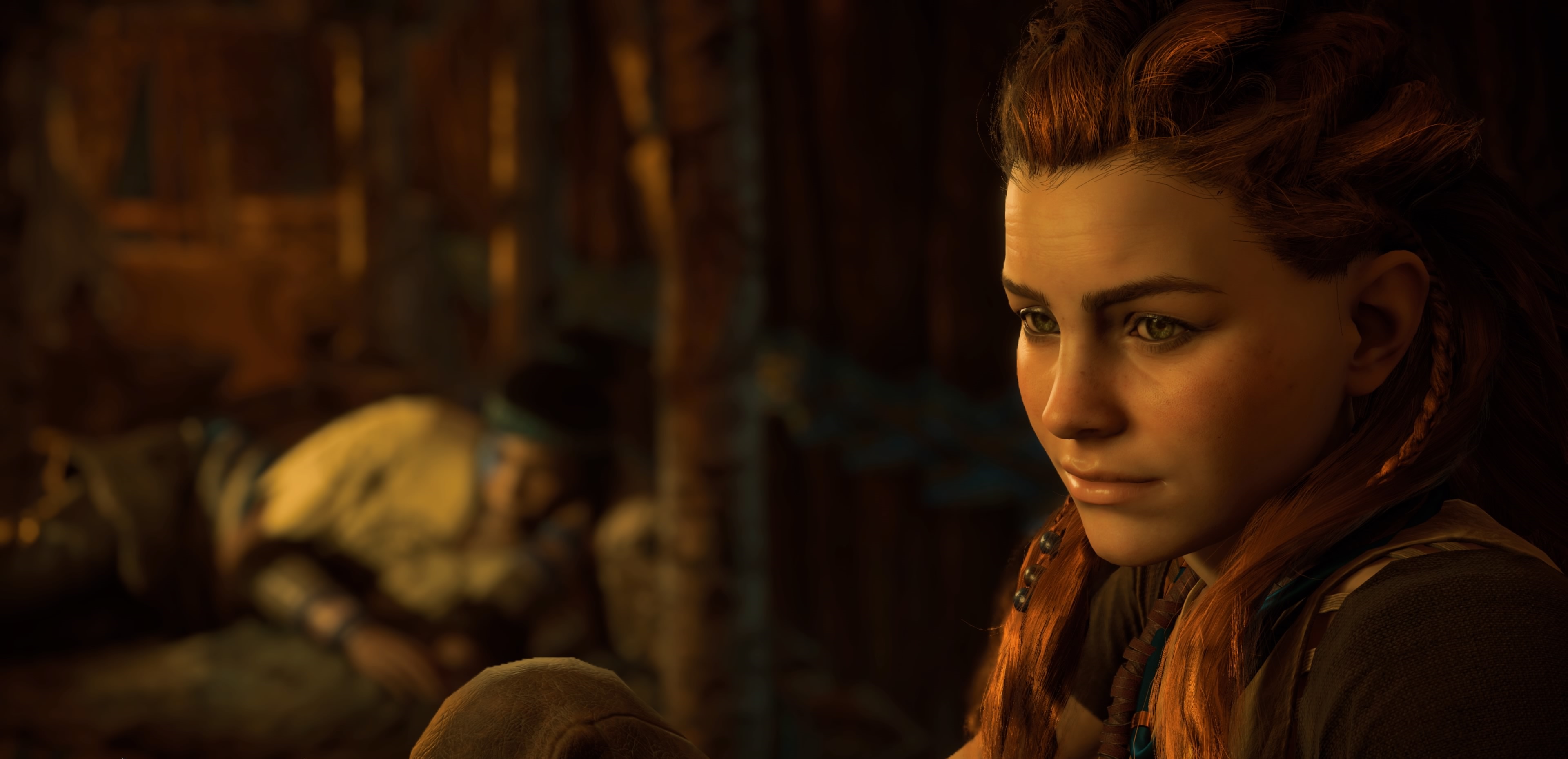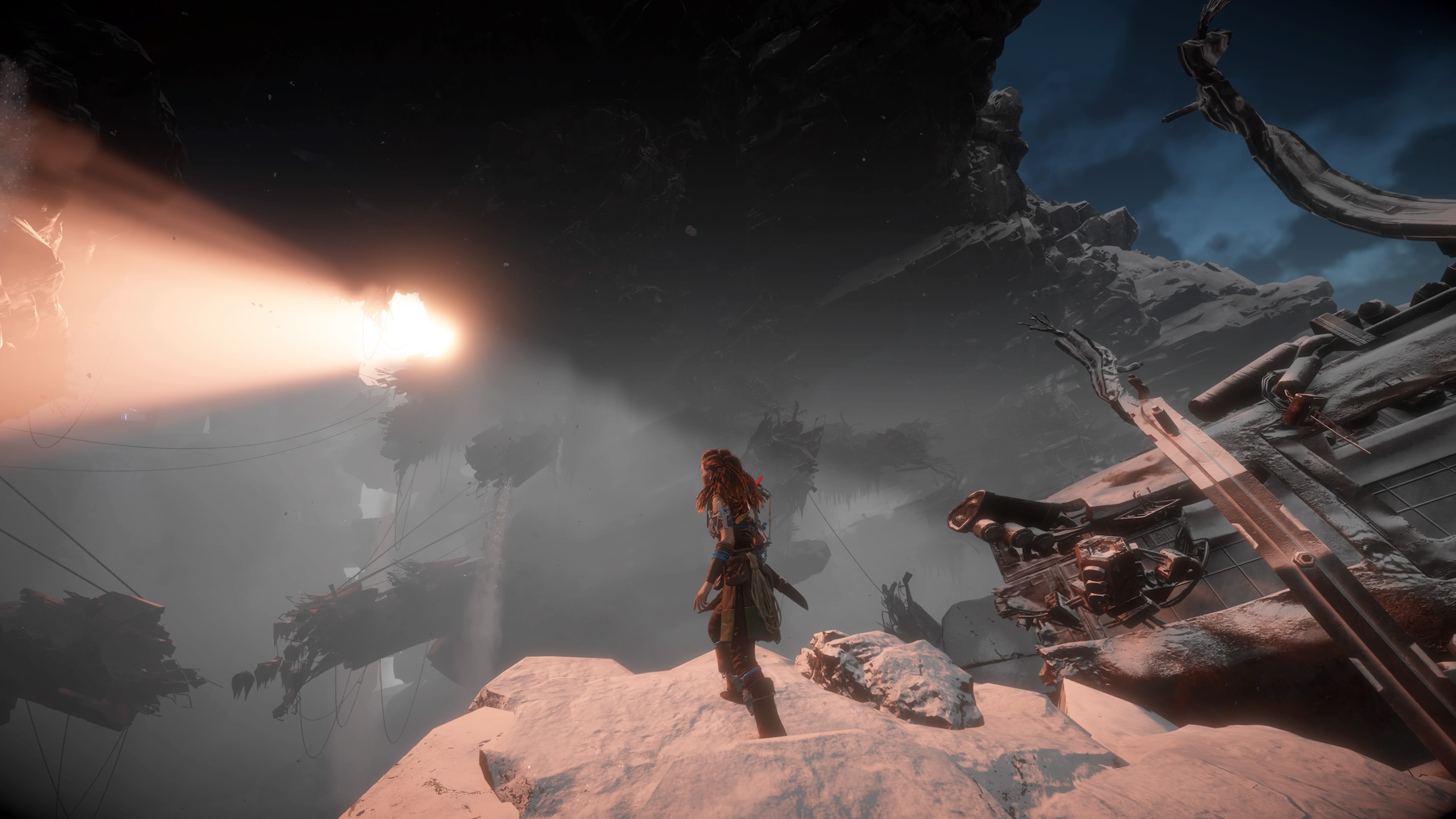 Je peux évoquer aussi l’herbe qui bouge sur nôtre passage, les traces de pas sur la neige, les cheveux d’Aloy ondulant au vent et que l’on pourrait presque compter un à un. Les effets d’ombre et surtout de lumière avec un lens flare tellement crédible que ça en est parfois aveuglant. Et même le monde du jeu se reflétant à travers ses pupilles…