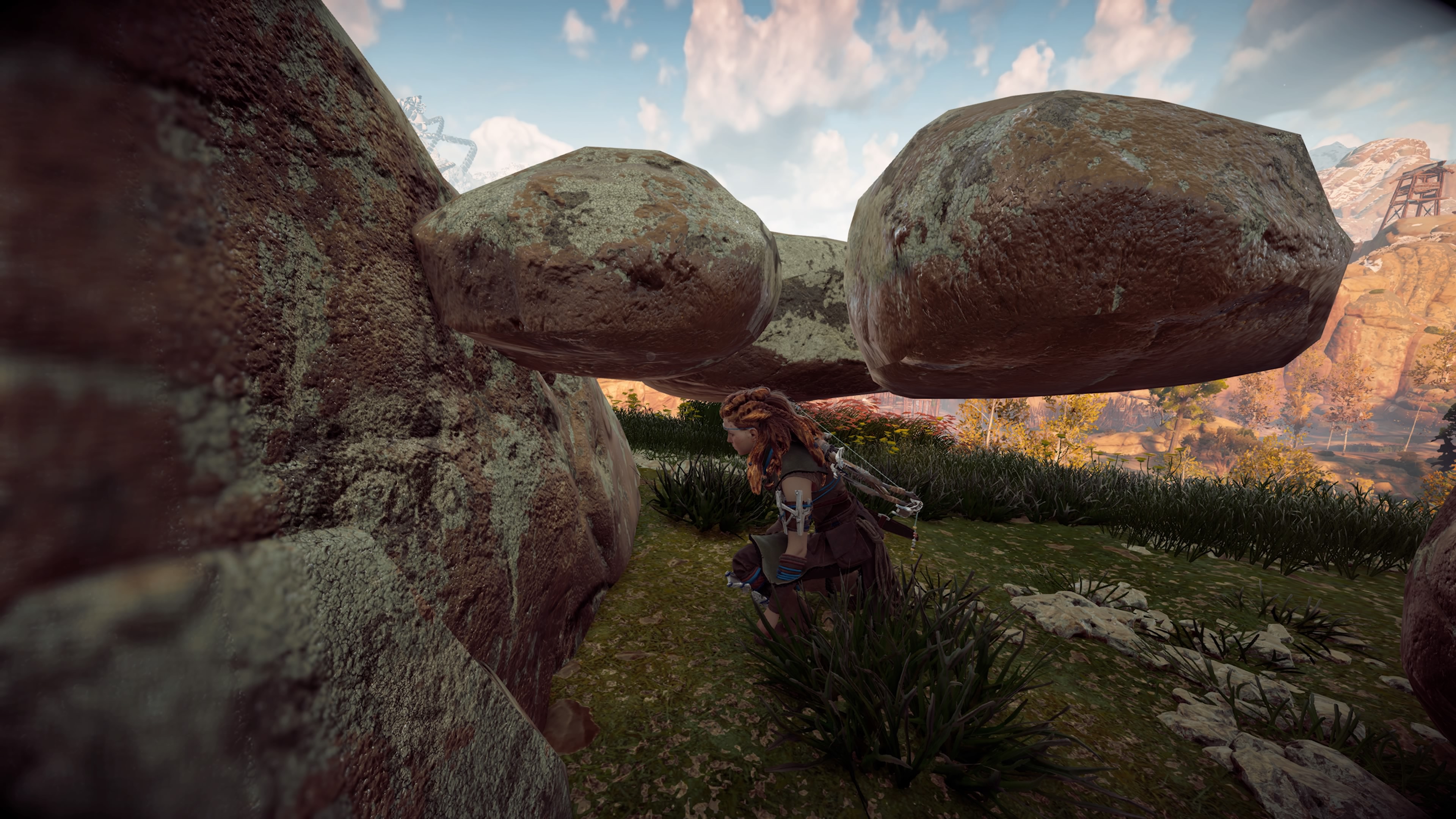Mais tout n’est pas parfait. Comme l’eau légèrement en deçà en termes de modélisation et manquant de relief. Des variations climatiques assez abruptes avec un passage entre la pluie et le beau temps se faisant en un quart de seconde. Quelques errances visuelles comme ces rochers ci-dessus semblant léviter. Ou encore la tenue de l’héroïne portée en plein jeu, changeant en pleine cinématique pour la tenue par défaut.