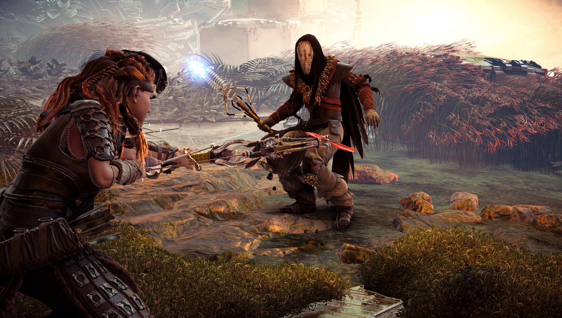 Hors combat, l’interaction avec ces machines se fait via notre lance qui ne sert pas qu’à attaquer au corps à corps. Car elle permet aussi de les pirater pour peu qu’on ait débloqué la capacité en explorant les Creusets dédiés. À l’exception de celles qui sont déjà corrompues et plus puissantes que leur congénères. L’intérêt est de pouvoir en faire des montures pour aller plus vite, mais surtout de les retourner les uns contre les autres. Ce qui aide beaucoup lors d’une partie de chasse puisque l’attention de la cible sera attirée sur son congénère corrompu par nos soins.