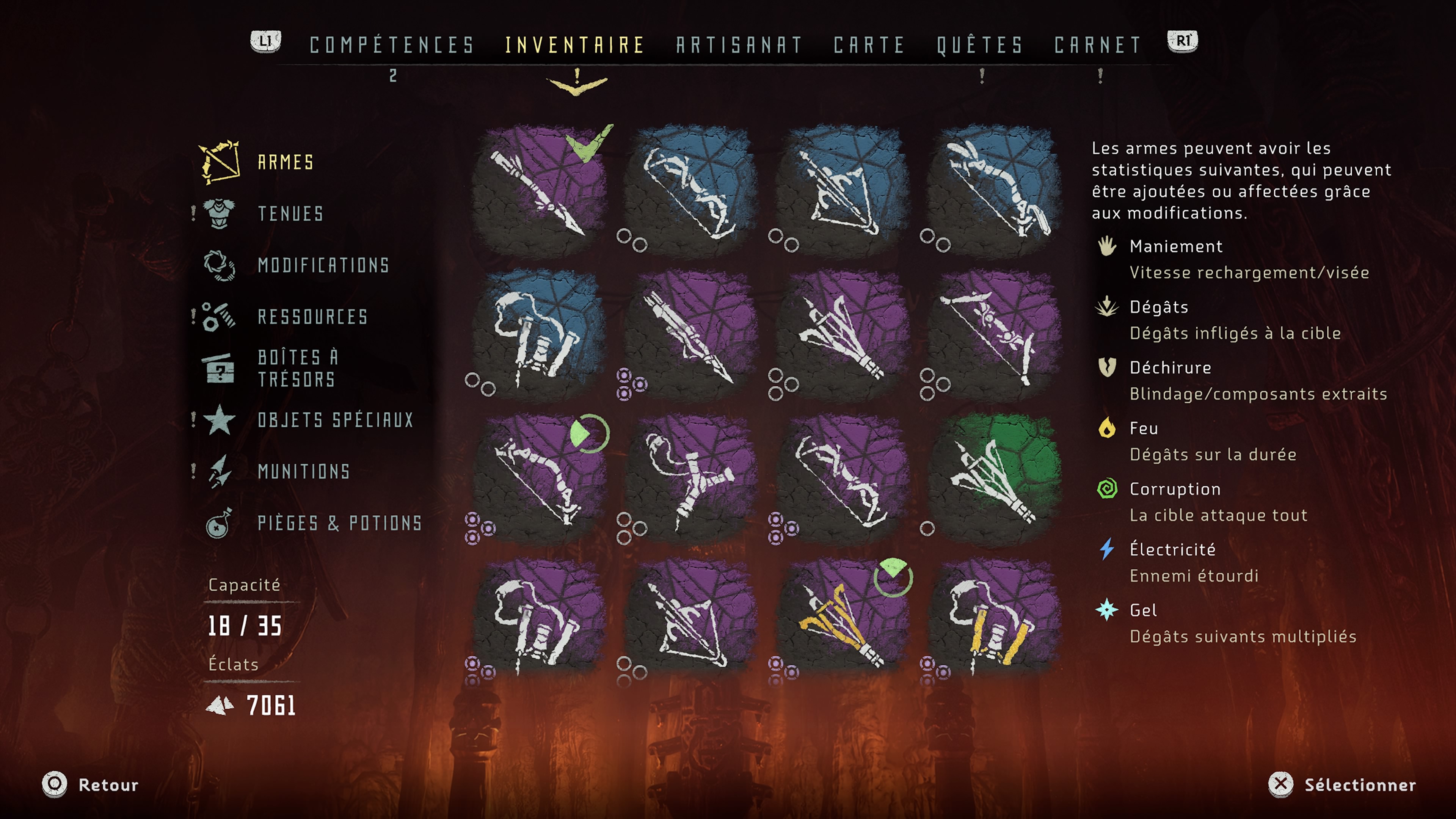 En termes d’équipements, c’est plus ou moins varié. Avec des armes qui existent en plusieurs déclinaisons faisant qu’on s’y perd un peu. Je pense qu’il aurait été plus judicieux d’en regrouper certaines afin d’en faire une arme à part entière. Comme l’arc qui est décliné en « guerre », « chasseur », et « précision ». Ma préférée étant le lance-corde très efficace contre ces (foutues) machines volantes, pour peu qu’on ait lâché suffisamment de cordes pour les soumettre.