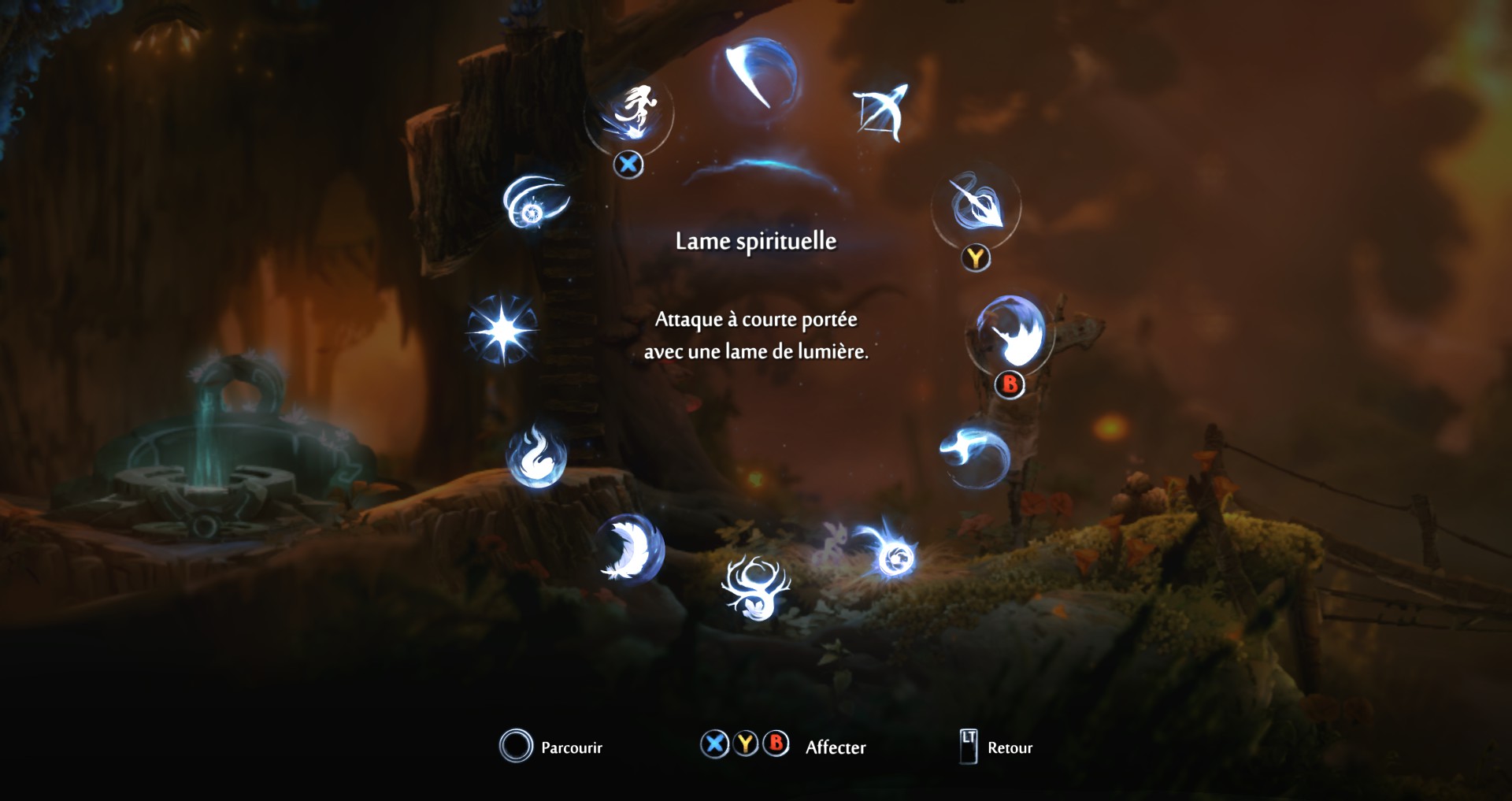 Y a pas à dire, le gameplay s’est bien enrichi depuis l’opus précédent où on ne pouvait qu’attaquer indirectement avec des orbes de lumière. Maintenant, Ori s’est doté d’un véritable arsenal de guerrier avec entre-autres une Lame spirituelle pour le corps à corps, un Arc spirituel pour tenir les ennemis à distance. Et leurs versions « améliorés » respectives avec le Marteau plus lent à manier mais faisant de gros dégâts aux créatures et au décor désormais destructible. Et la Lance faisant encore plus de dégâts mais dépensant une grande quantité d’énergie. Manquerait plus qu’un bouclier tiens.