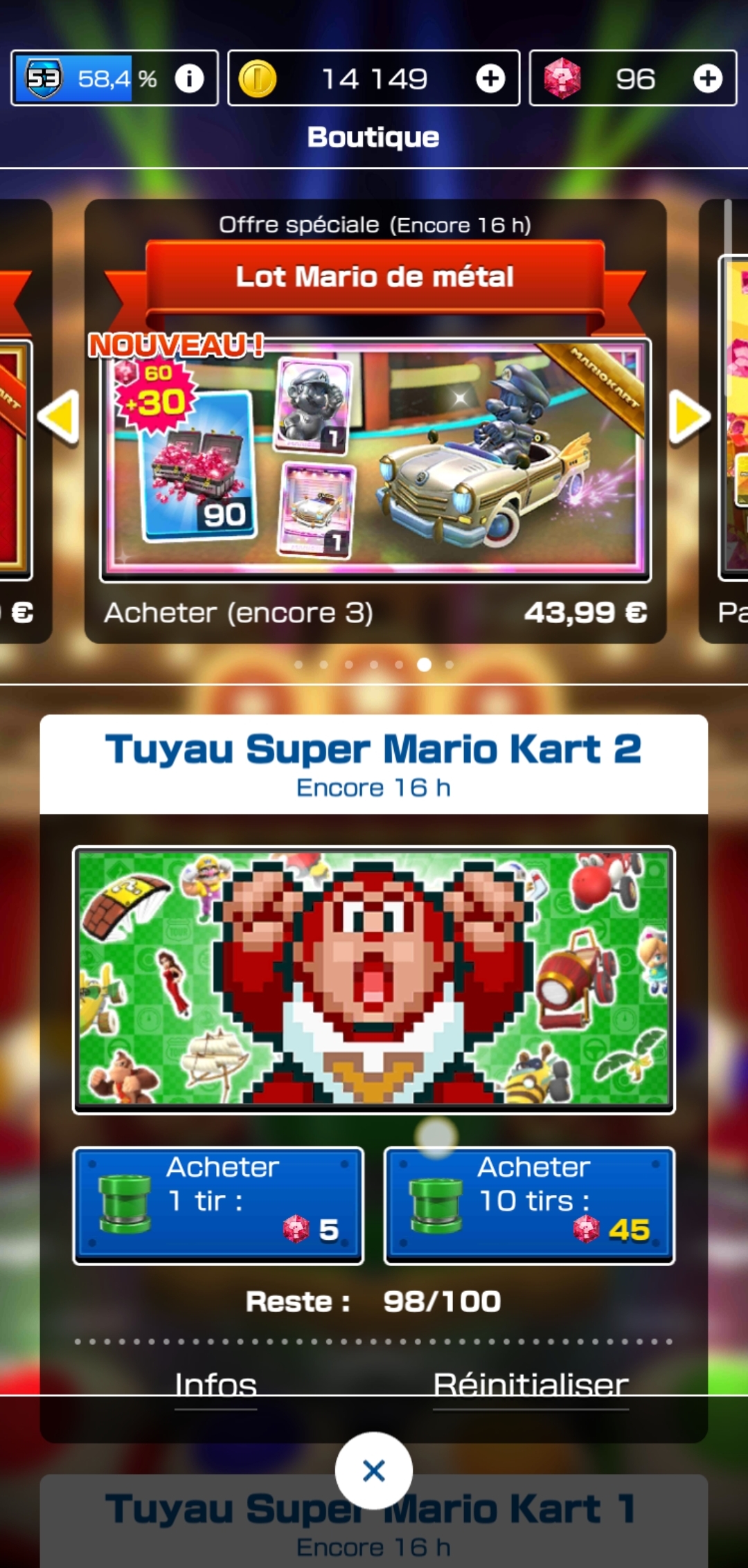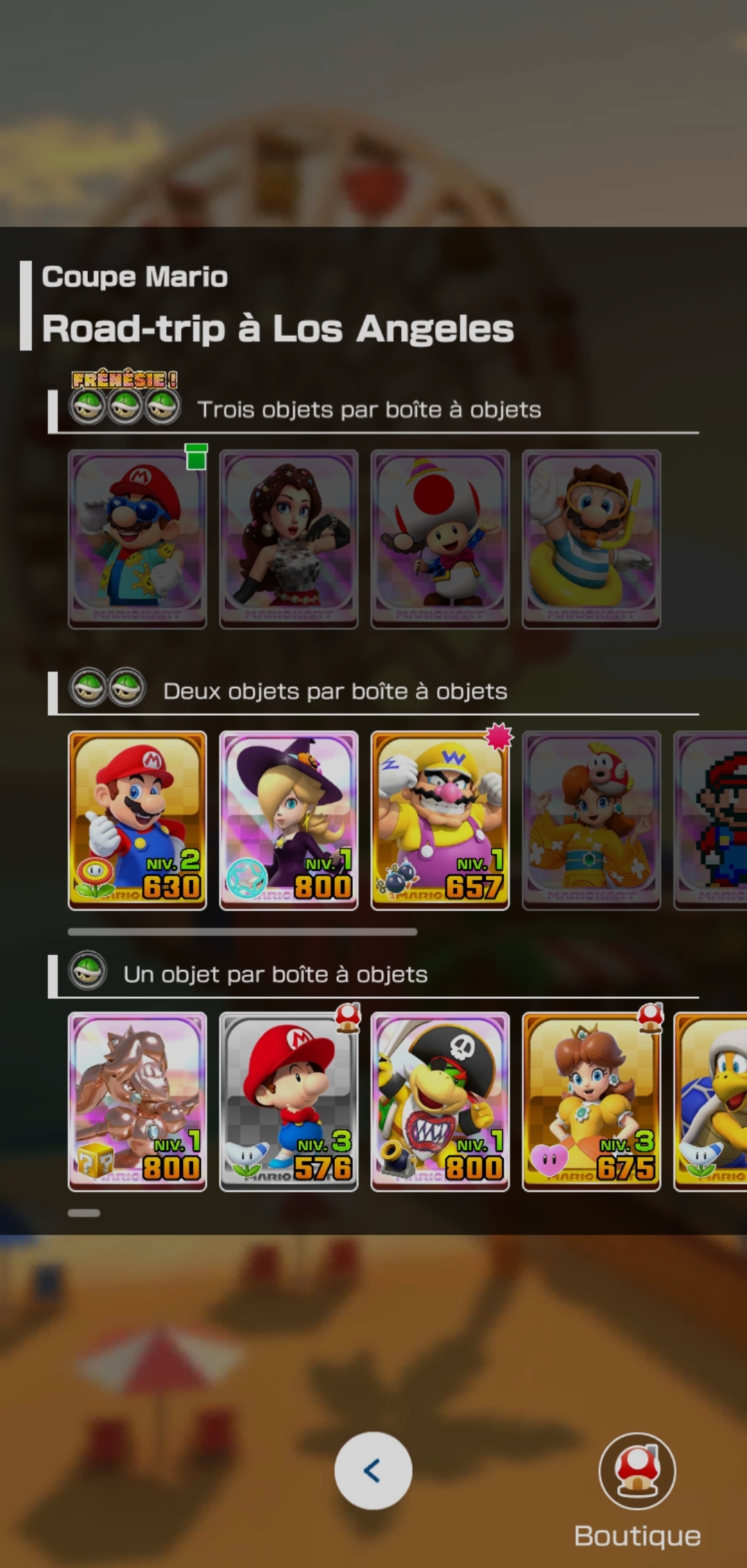 On pourrait se dire que c’est suffisant mais même pas. Car certains scores ne sont atteignables qu’avec des personnages, karts, et deltaplanes spécifiques que l’on ne choisit plus comme c’était le cas avant, mais qu’on nous impose à chaque course. Les trois captures ci-dessus illustrent bien le problème. Si je veux taper le meilleur score, je suis forcé de le faire avec des éléments que je n’ai pas forcément sous la main, et que je n’obtiendrai jamais à moins d’avoir de la chance avec les Tuyaux permettant d’en gagner. À moins de lâcher beaucoup d’argent (réel) dans des items ou souscrire au Pass Or. Parlons-en d’ailleurs.