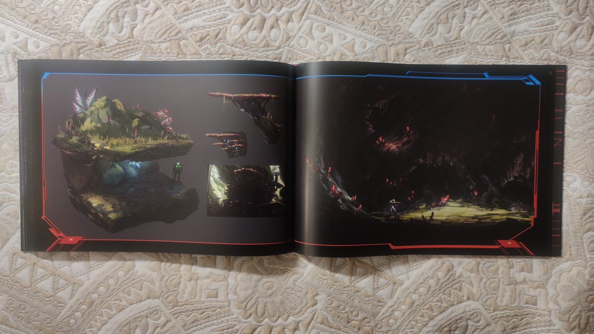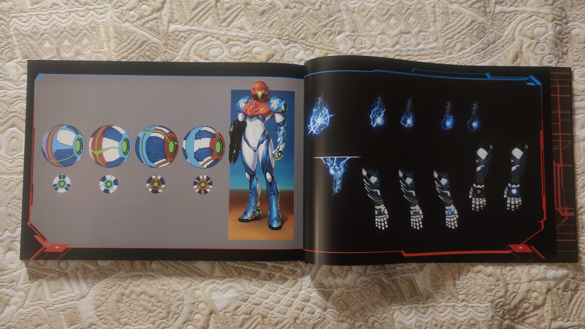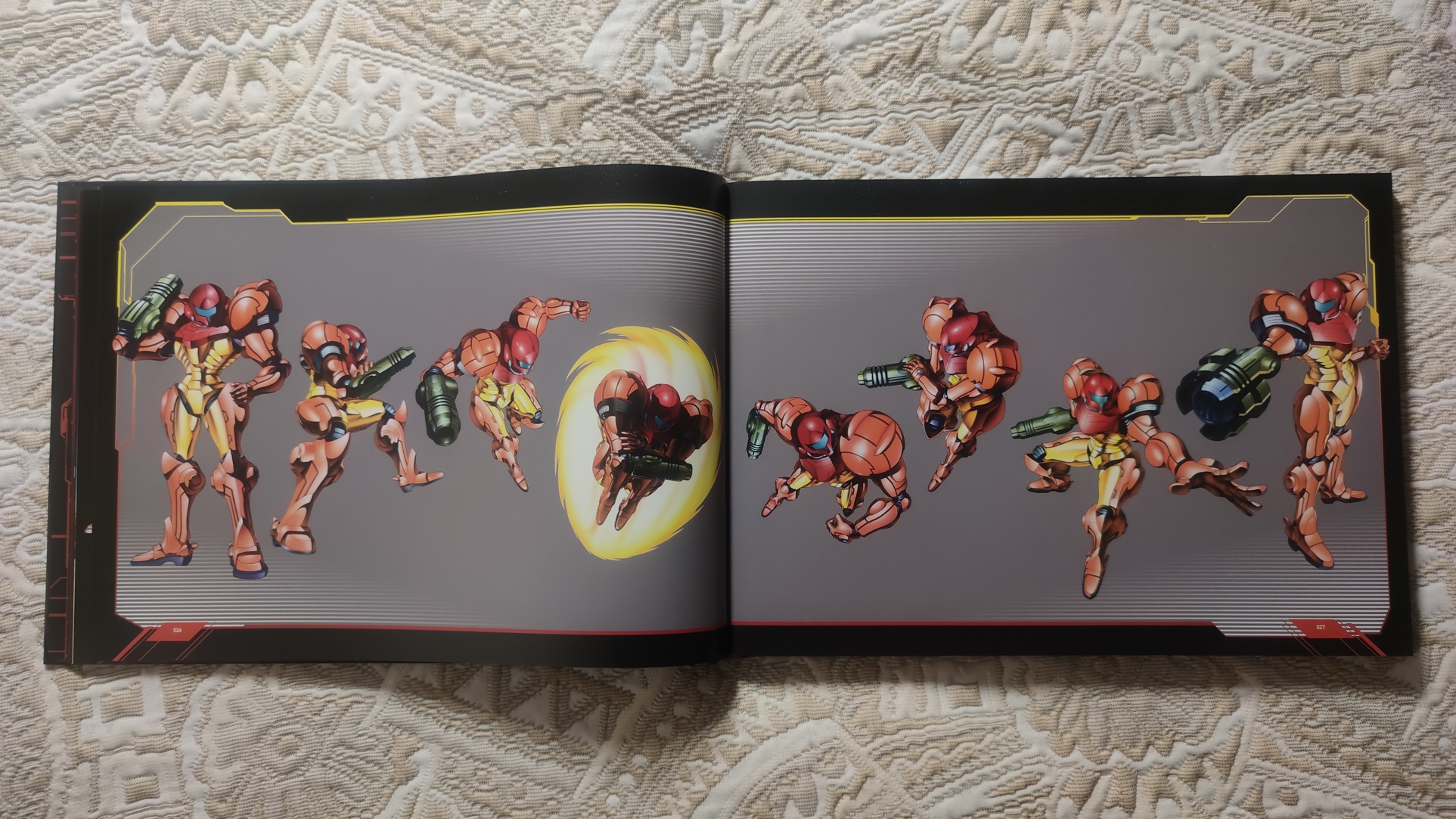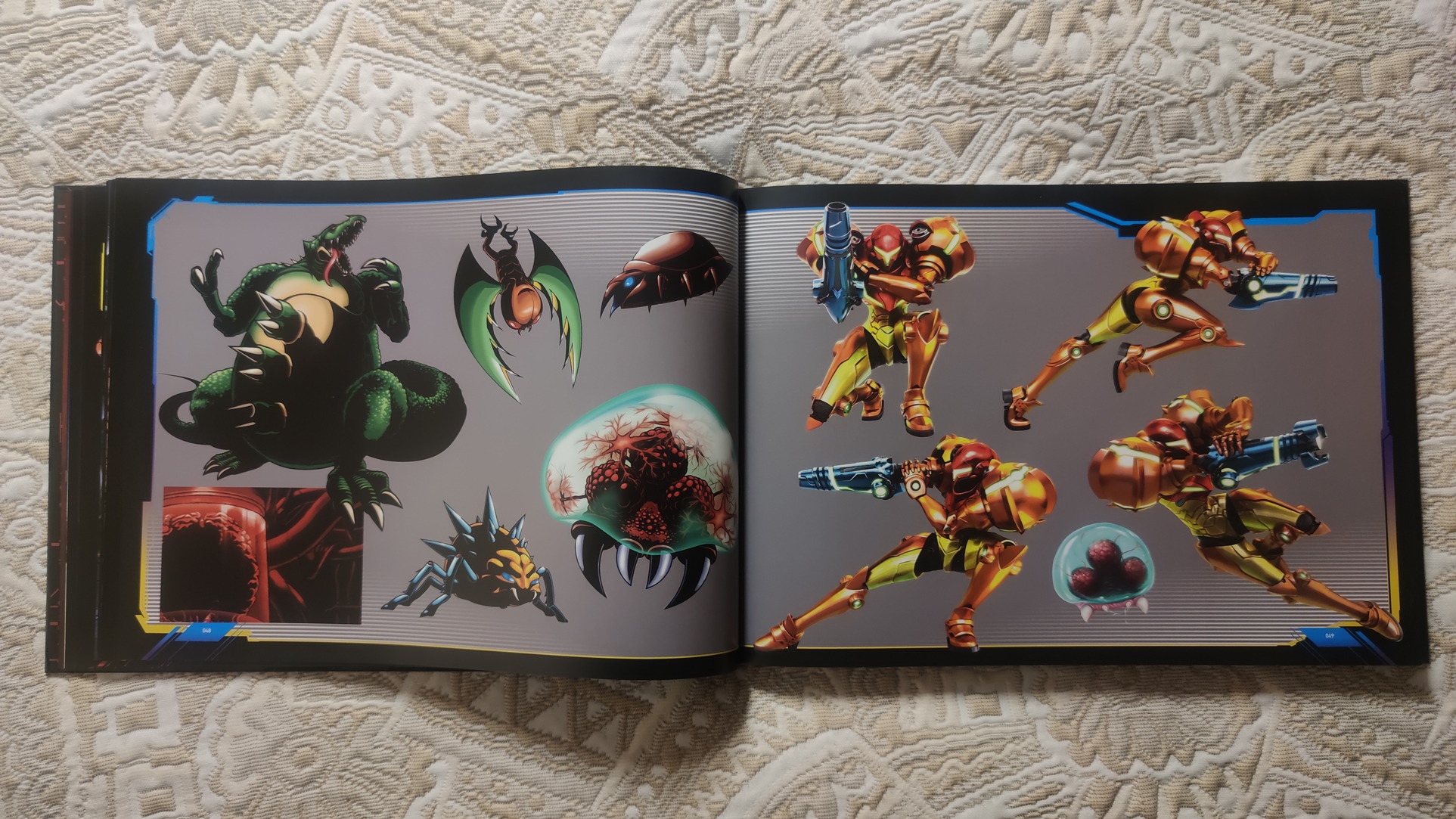Et enfin au fond de la boite se terre l’Artbook, ou devrais-je dire le « Journal de Missions » de 190 pages. Arborant une couverture rigide et retraçant de manière non exhaustive mais suffisante, 35 ans d’illustrations avec les artworks officiels depuis le tout premier opus sur NES jusqu’à celui sur Switch. D’ailleurs, il y a même davantage d’illustrations dans les pages dédiés à Samus Returns que dans l’Artbook du collector de ce même opus. En voici un petit aperçu.