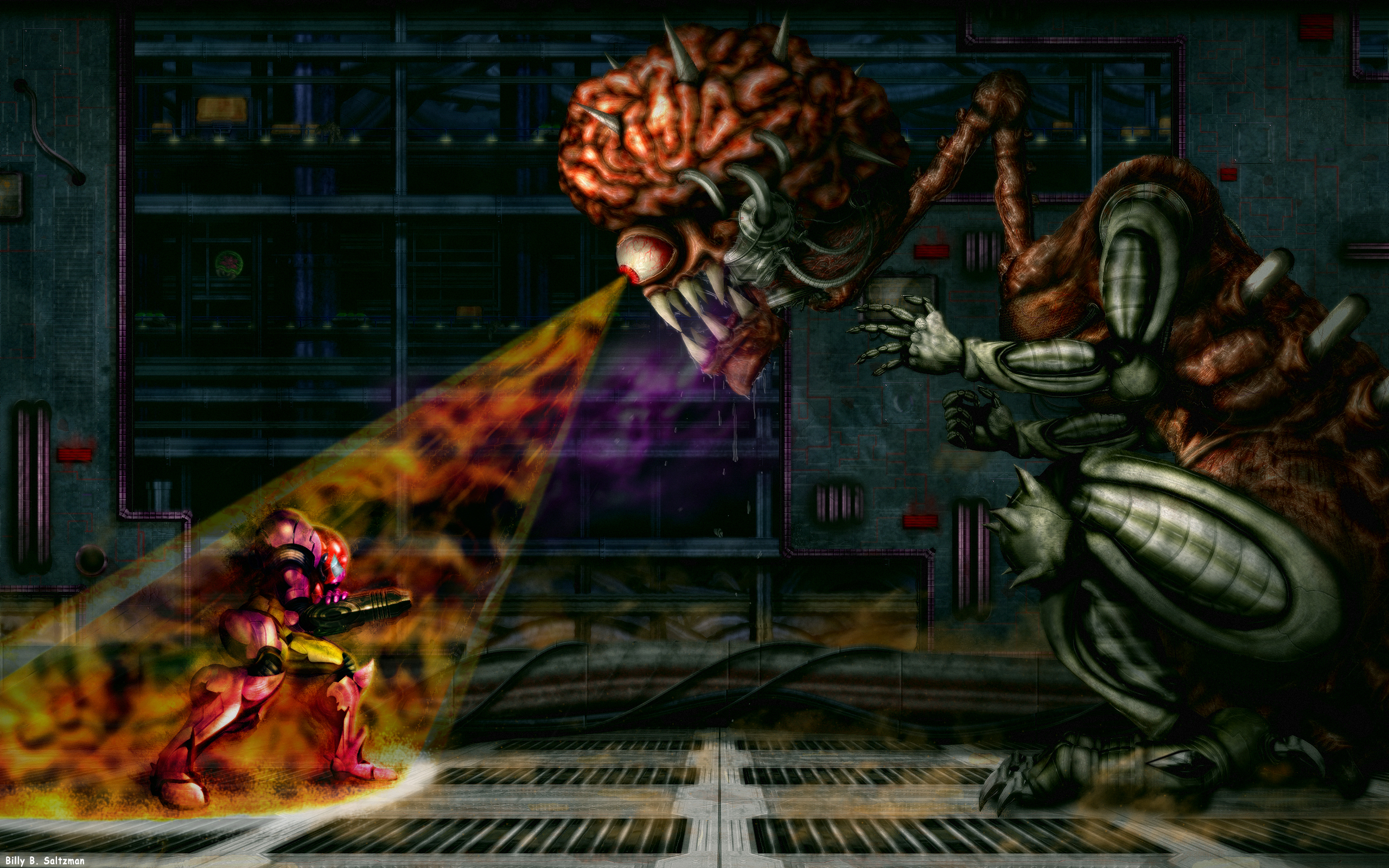 Ce moment fatidique où MB balance son rayon de la mort face à une Samus impuissante et aux portes de la mort. Jusqu’à ce que le bébé Metroide, qui par sa taille démesurée pour son espèce est devenu le Super Metroïde donnant son nom au jeu, sauve Samus in-extremis en aspirant une partie de l’énergie vitale de MB qu’il restituera à sa « mère ». MB finira par se réveiller et achèvera ce Metroïde. Qui dans un baroud d’honneur, transmettra l’hyper rayon à Samus qui lui permettra d’en finir une bonne fois pour toute durant une séquence épique et jouissive pendant que le thème de la Space Warrior se joue en arrière-plan.