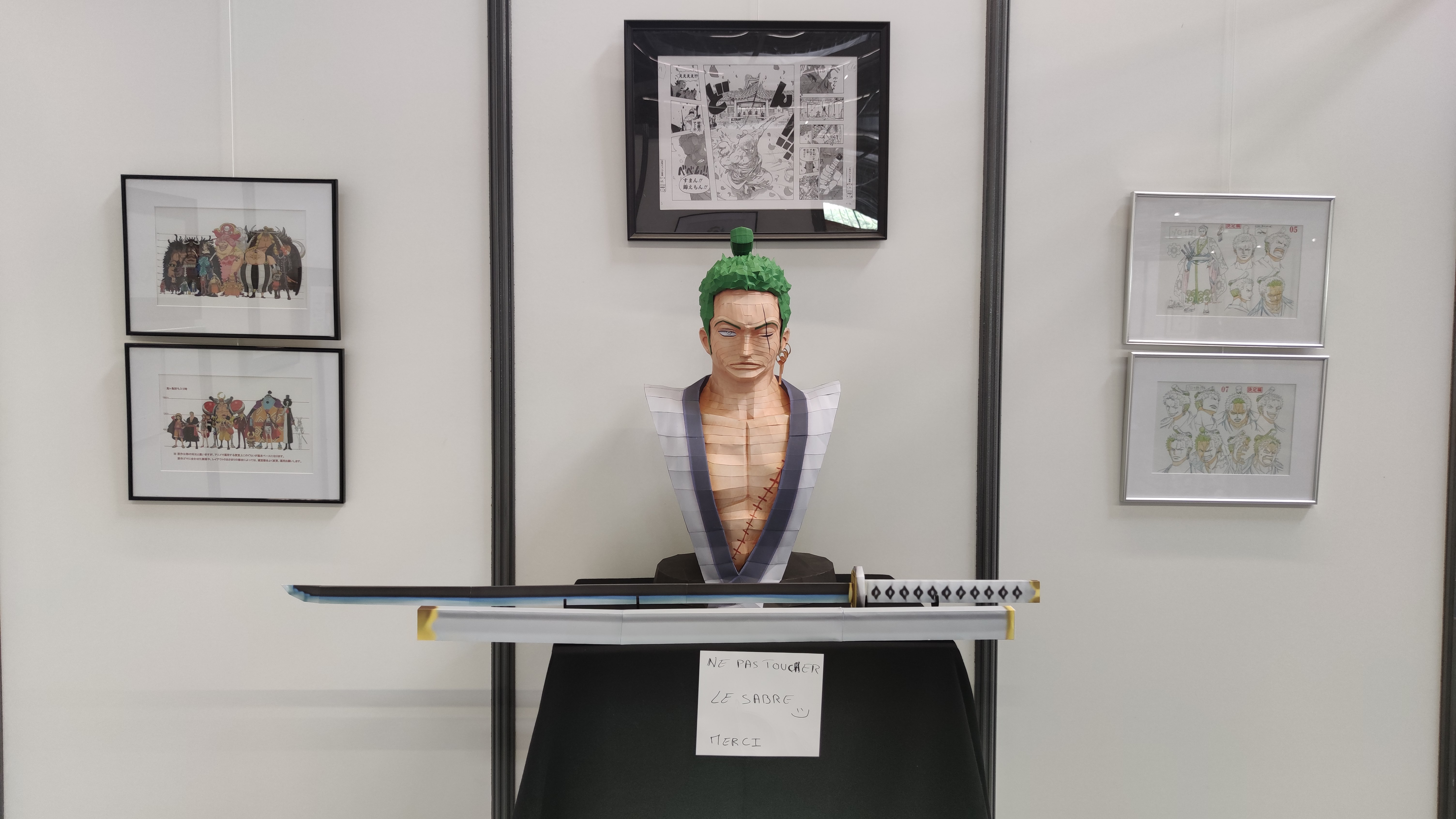 Un Zoro et ses sabres entièrement faits de papier qui ont dû nécessiter un nombre faramineux de pliages.