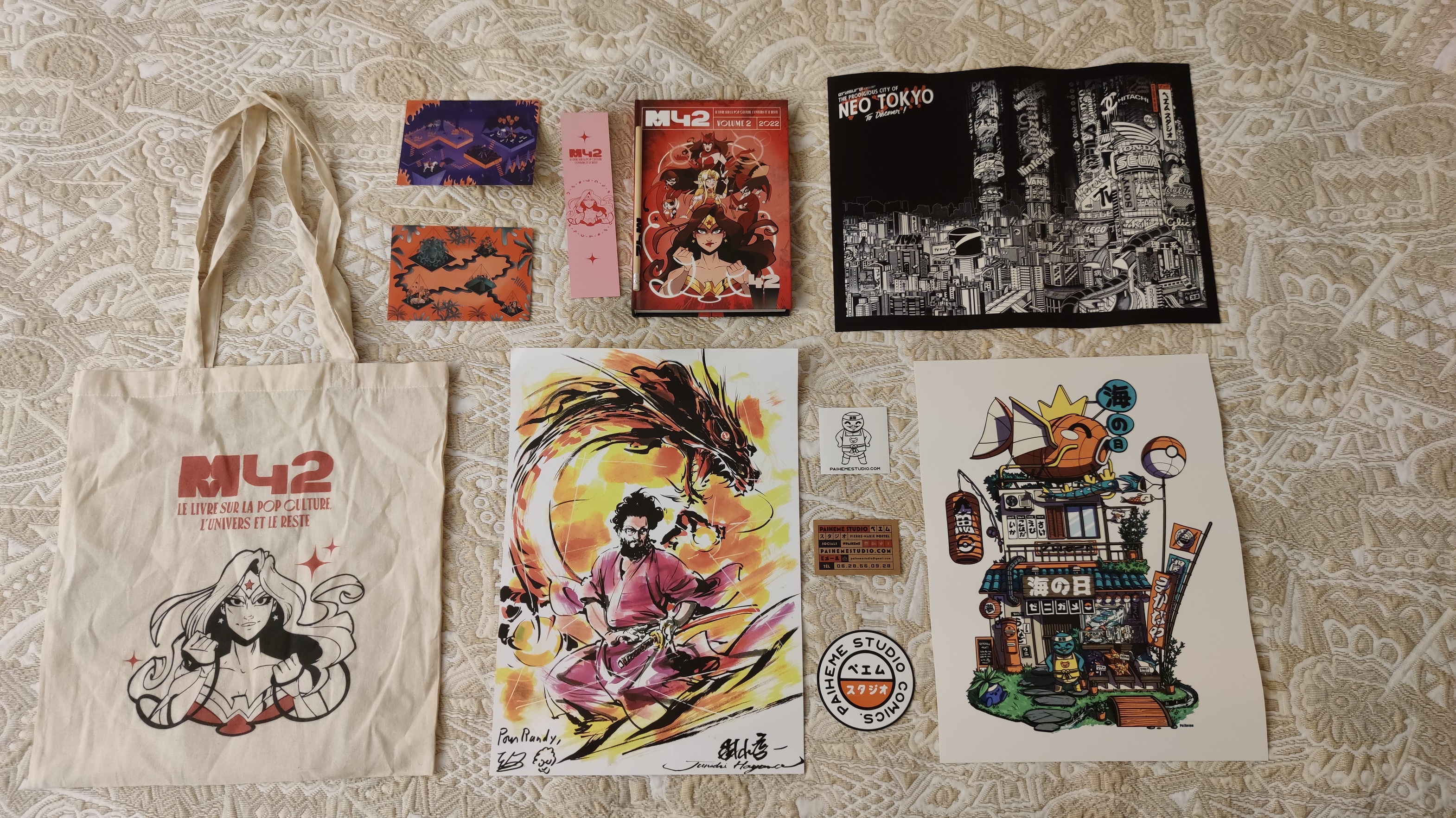 Mon loot d’Animasia comprend le livre et tote-bag M42, un poster de l’Ermite Moderne dessiné par Jun’Ichi Hayama (Ken le Survivant, JoJo), deux posters de Paiheme.