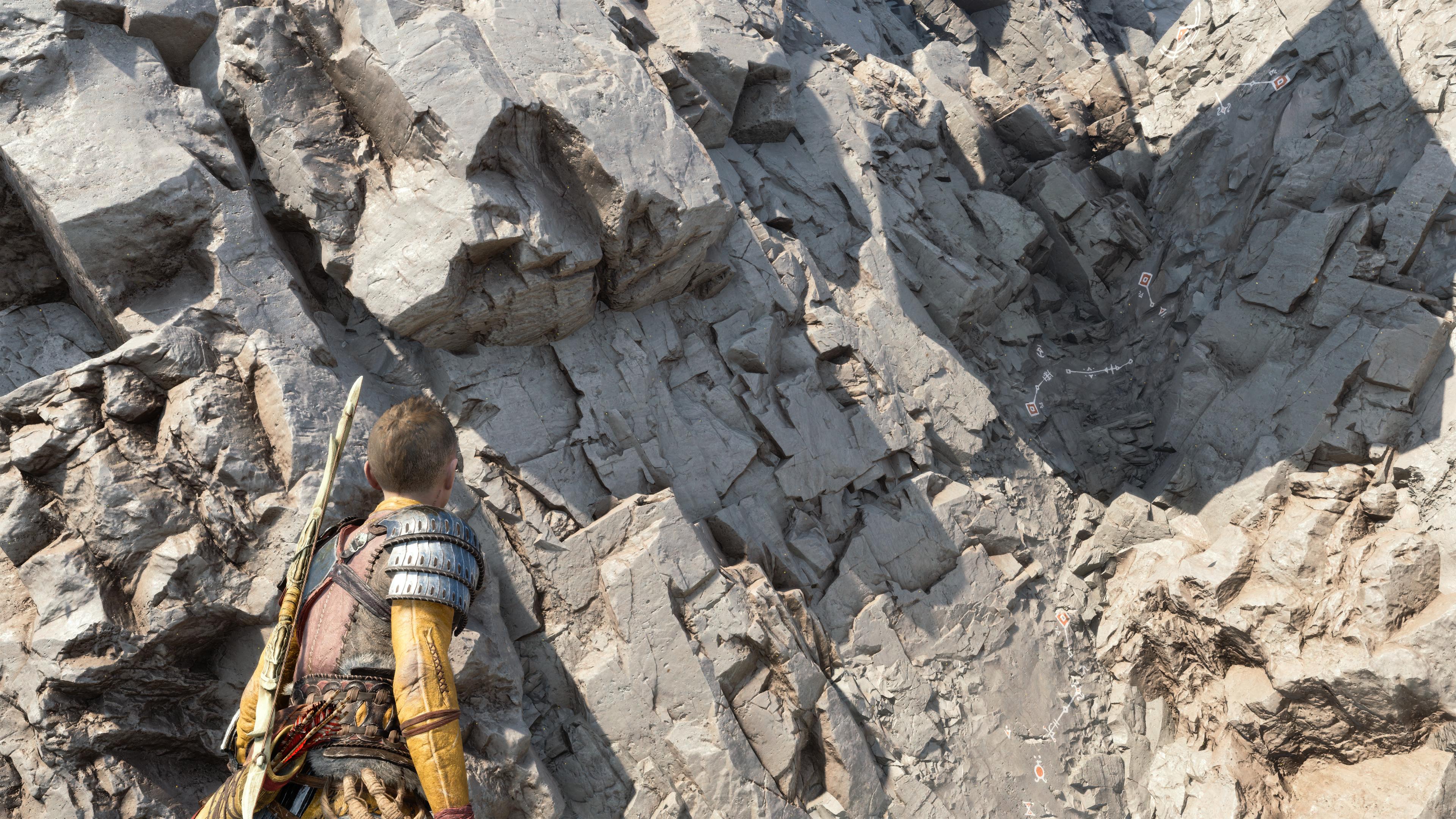 Surtout que Ragnarök est un jeu bien dirigiste dans sa construction tout comme son prédécesseur. Où l’on doit aller d’un point A vers un point B en passant par des sentiers prédéfinis. Je pense aux symboles et flèches directionnelles incrustées de manière absolument pas subtile sur des parois d’escalade pour bien indiquer qu’il faut grimper par là et pas ailleurs. Une mécanique usée depuis tellement longtemps dans le média et qu’il faudrait sérieusement revoir.