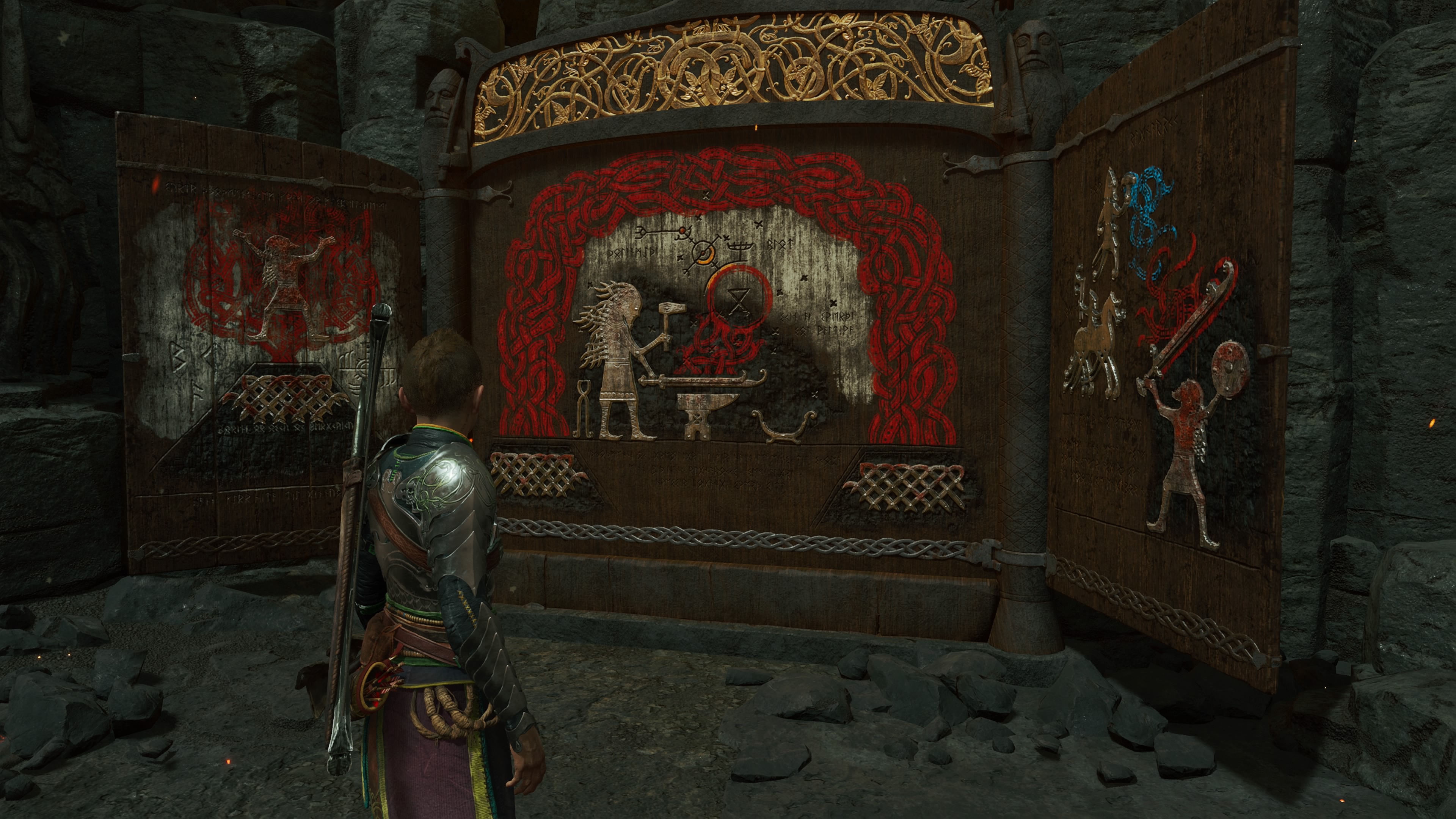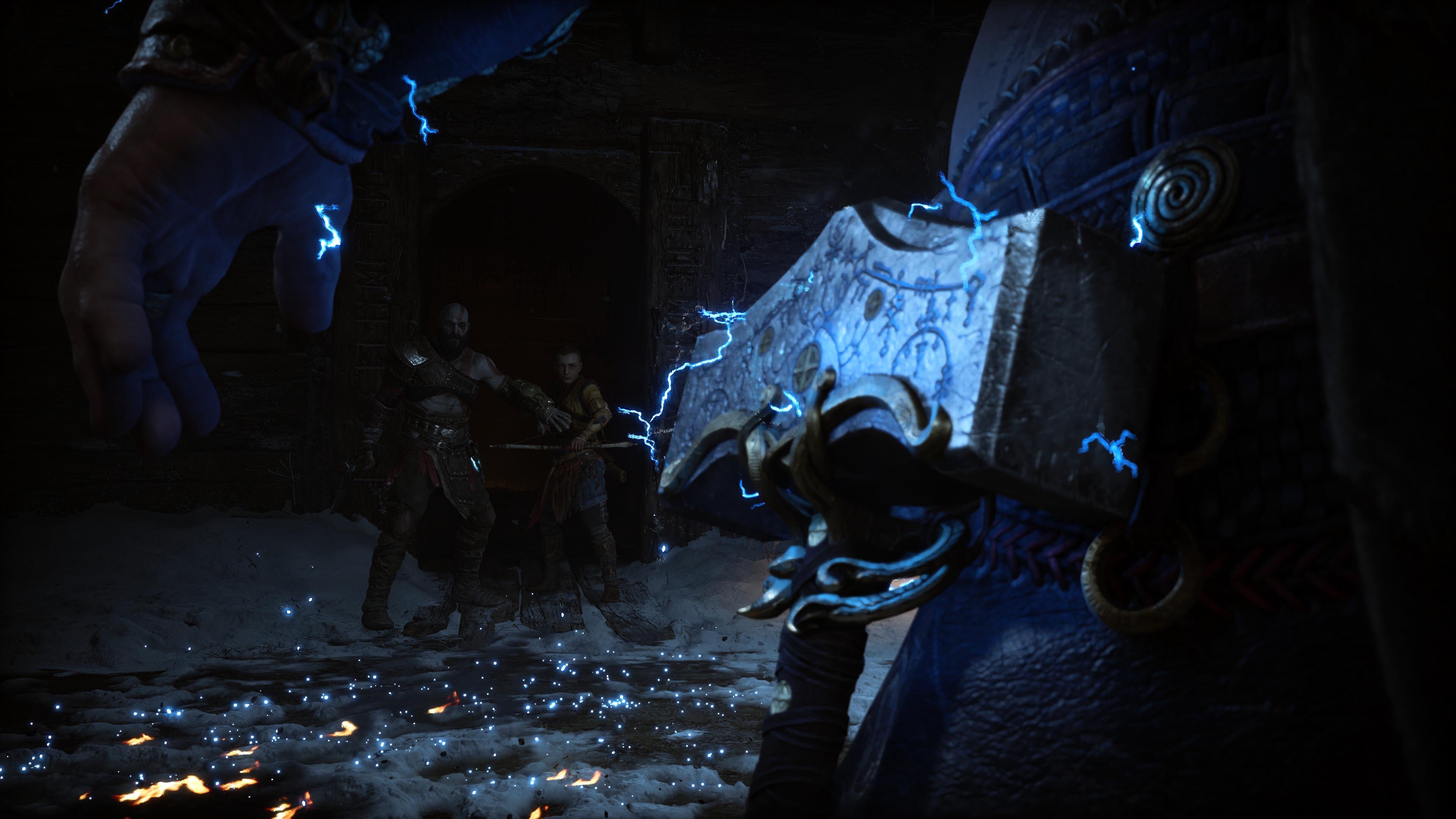 Pas de surprises non plus pour les énigmes qui pour la plupart sont les mêmes qu’avant dans leurs mécaniques. Entre les éléments à geler avec la Hache, ceux à enflammer avec les lames, les coffres à ouvrir en débusquant les runes qui leur servent de serrure, c’est du déjà-vu à tous les niveaux. Ou presque, car une des énigmes récurrentes consiste à faire rebondir la Hache sur des pierres spéciales qui, selon l’angle choisi, peut faire ricochet sur d’autres pierres ou des mécanismes hors d’atteinte autrement.