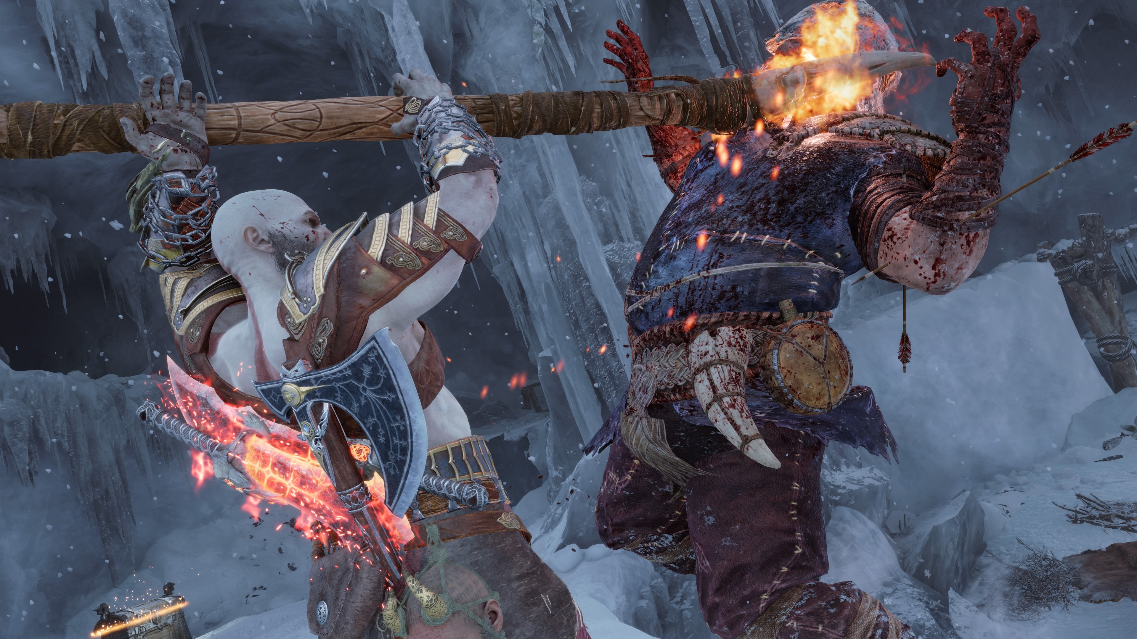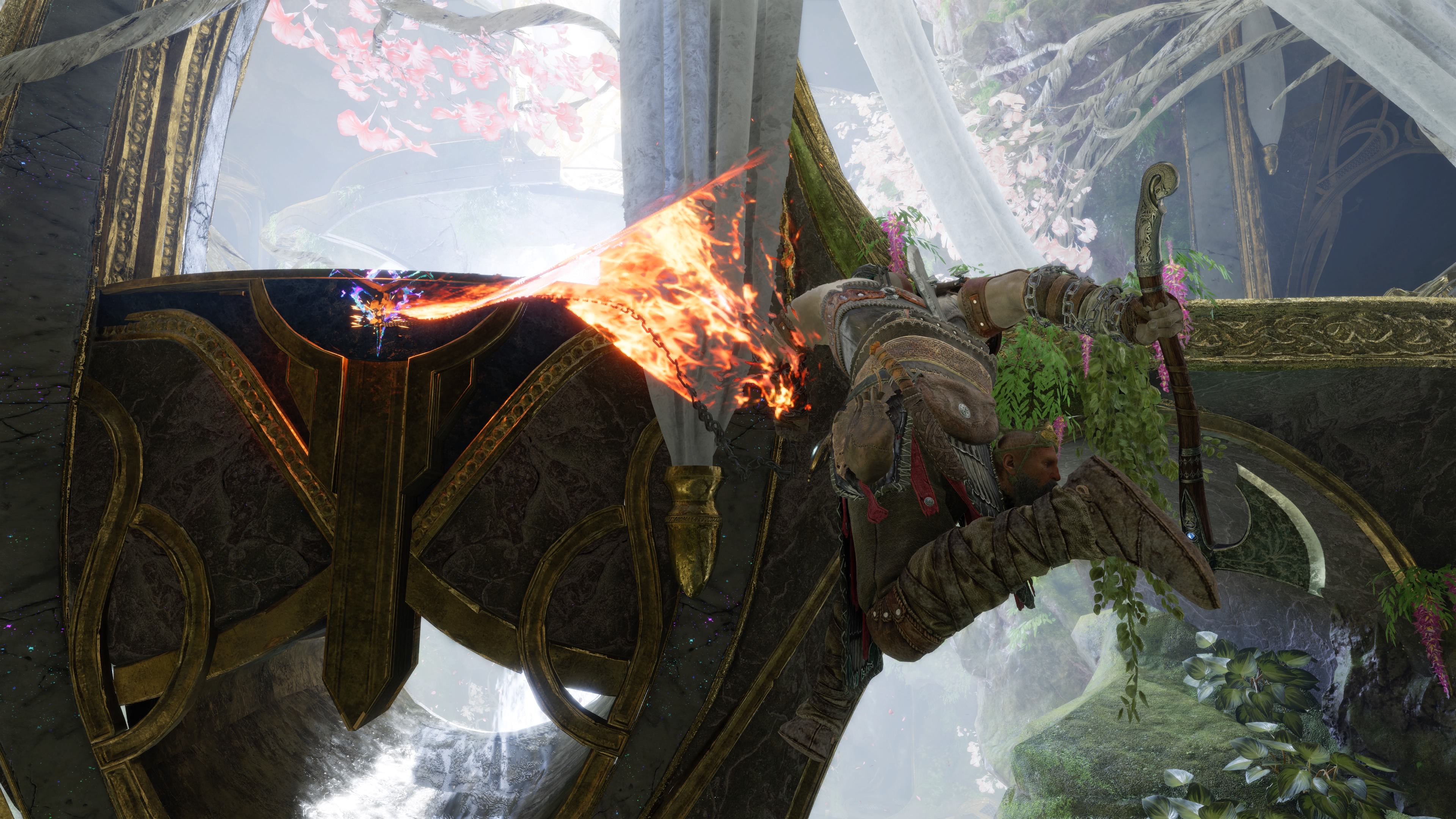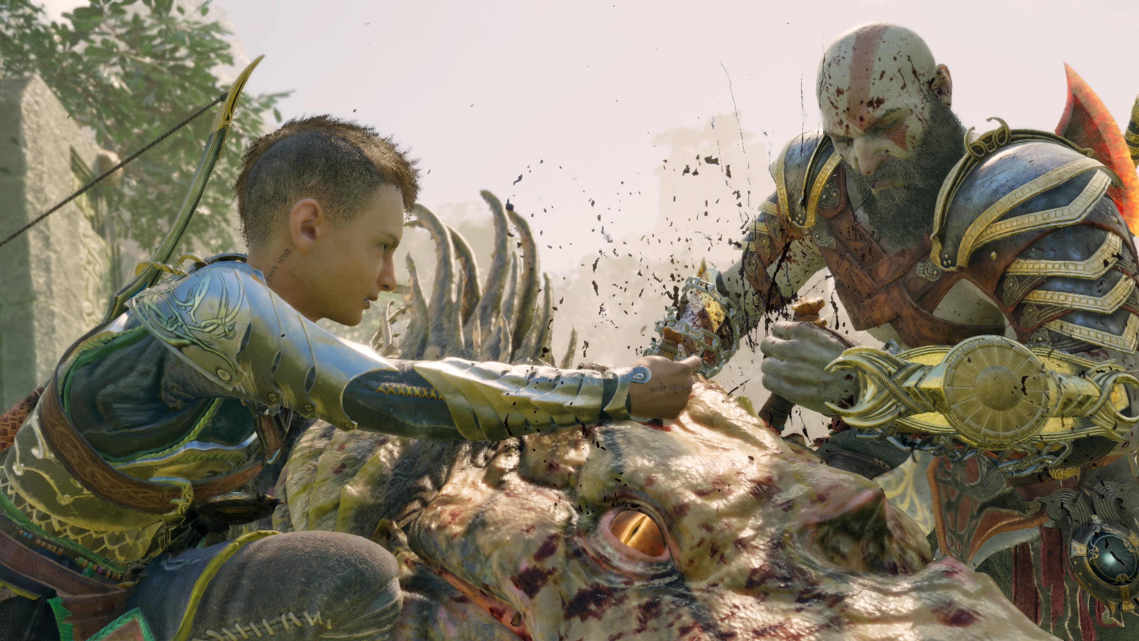 Concernant le gameplay, c’est toujours aussi efficace et on reste sur les mêmes bases solides. La traditionnelle Hache Léviathan, et les mythiques Lames du Chaos récupérées dans le jeu précédent, se manient toutes deux comme avant. Même si hors combat, ces lames peuvent cette fois servir de grappin pour atteindre des recoins spécifiques. De plus, une troisième arme rejoindra l’inventaire d’une manière très bien intégrée dans l’histoire.