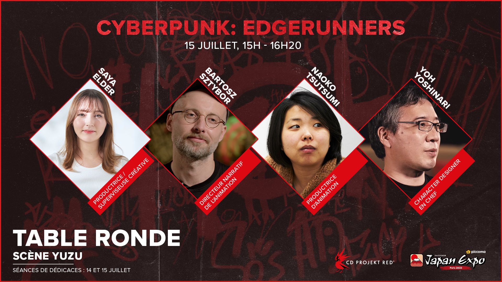 Et la dernière que j’ai vue le samedi après-midi, fut la table ronde réunissant une partie des équipes du studio de jeu vidéo polonais CD Projekt Red, et du studio d’animation japonais TRIGGER pour parler de l’anime Cyberpunk Edgerunners. Diffusé sur Netflix en septembre 2022, et que je recommande chaudement (même à ceux qui n’ont pas encore joué à Cyberpunk 2077 comme moi). Parmi eux, la productrice d’animation Naoko Tsutsumi. Le character design en chef Yoh Yoshinari. Le directeur narratif de l’animation Bartosz Sztybor. Et la productrice et superviseuse créative Saya Elder. Une série qui s’est fait récompenser au tout début de la conférence par le cofondateur de JE, Jean-François Dufour, du Daruma d’or du meilleur anime.
