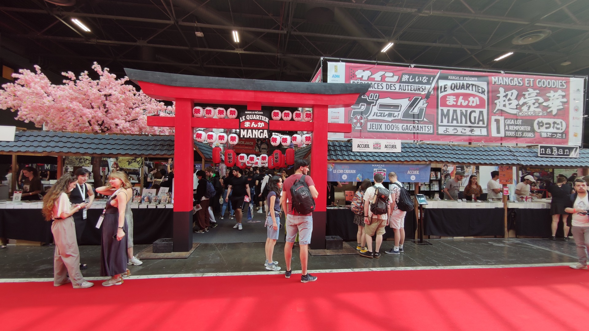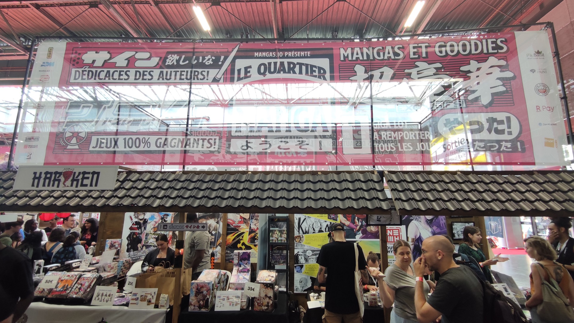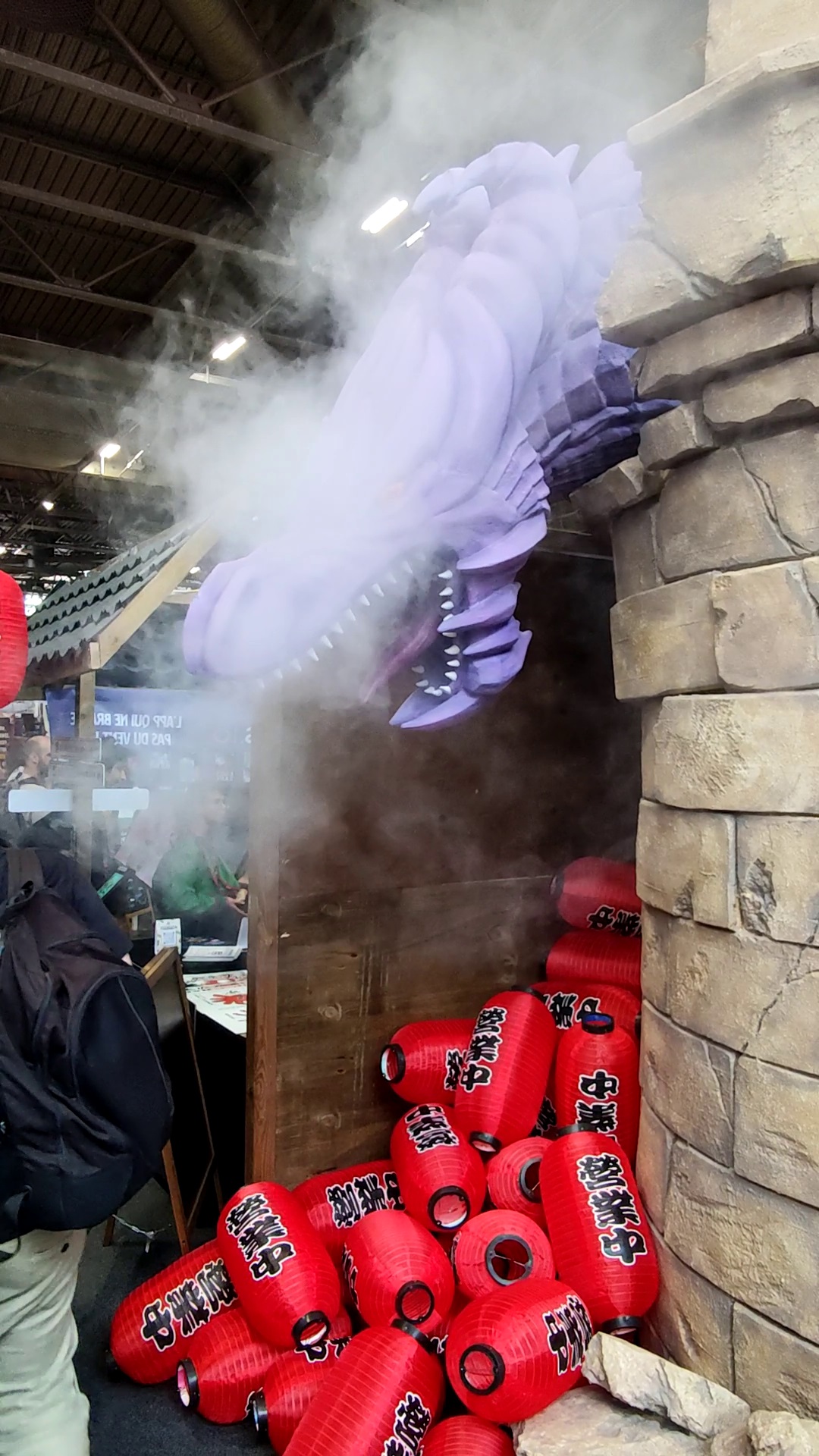 Le très chouette village Crunchyroll de l’année passée, a laissé place au Quartier Manga de Mangas.io situé au même endroit près de la sortie principale. Une zone de 180 m² qui mettait en avant des « petits » éditeurs comme Omaké Books, Chatto Chatto, Mahō, Naban, Nazca et d’autres. Un espace plutôt attrayant avec une architecture reprenant l’apparence des véritables quartiers japonais avec des allées assez étroites surplombées de lanternes. Et en son sein, un dragon fumant.