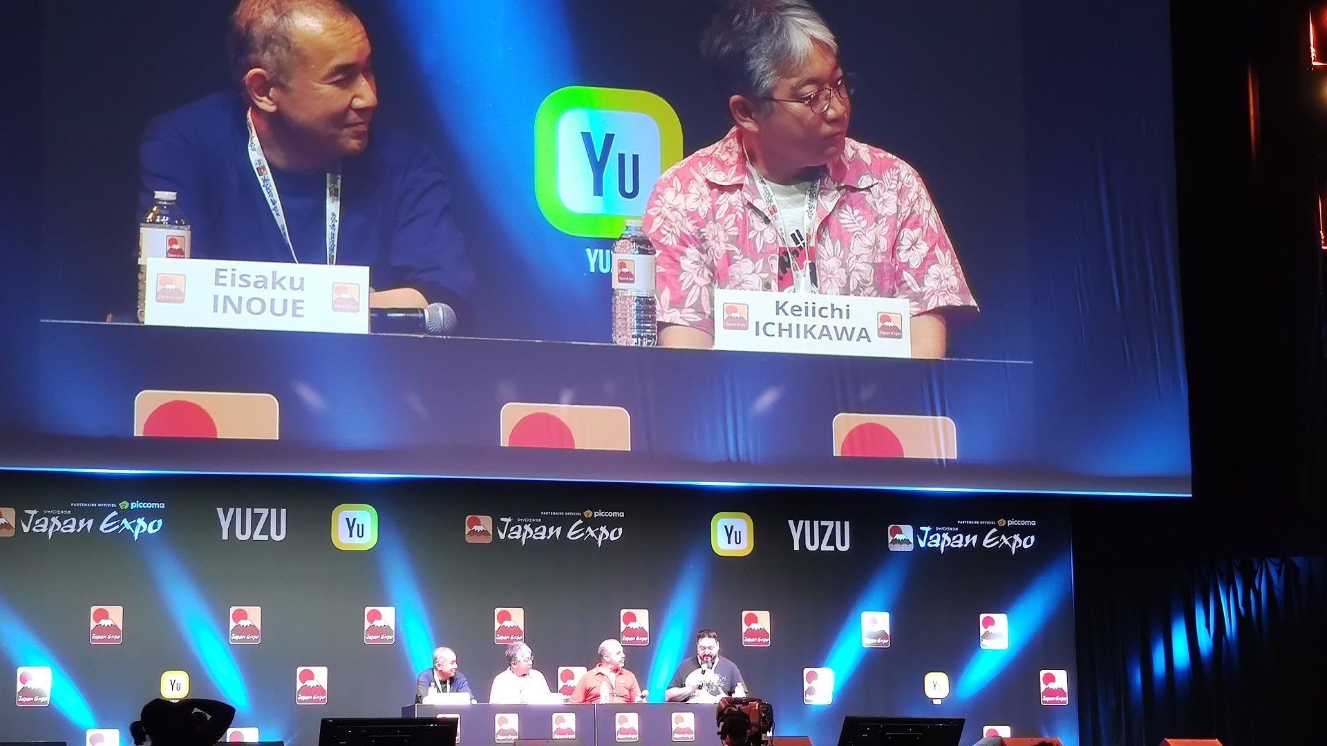 Pour en venir aux conférences auxquelles j’ai assisté à Yuzu, j’étais arrivé en plein milieu de celle d’Eisaku Inoue et Keiichi Ichikawa. Autrefois impliqués sur l’anime Saint Seiya, et aujourd’hui directeurs de l’animation de One Piece chez la Toei. Des postes extrêmement importants qui leur donnent une charge de travail monstre selon leurs dires. D’ailleurs, Inoue disait en blaguant que « ça ne le dérangerait pas d’être viré vu comment il bossait comme un esclave ».