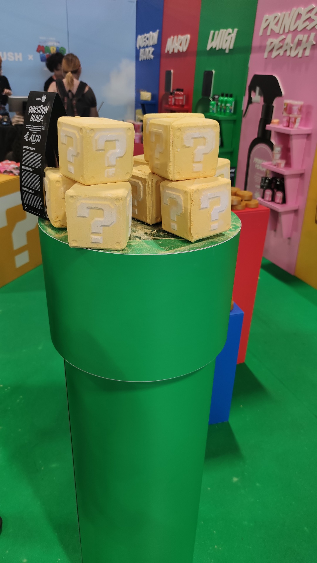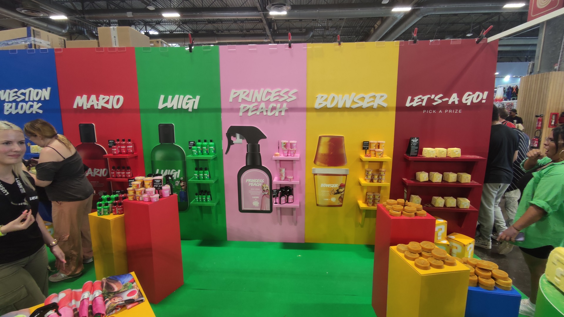 À deux pas de la zone Nintendo, le stand de LUSH qui proposait des produits cosmétiques en partenariat avec le film Super Mario Bros. Savons, gels douche, ou des bombes de bain en forme de blocs [?].