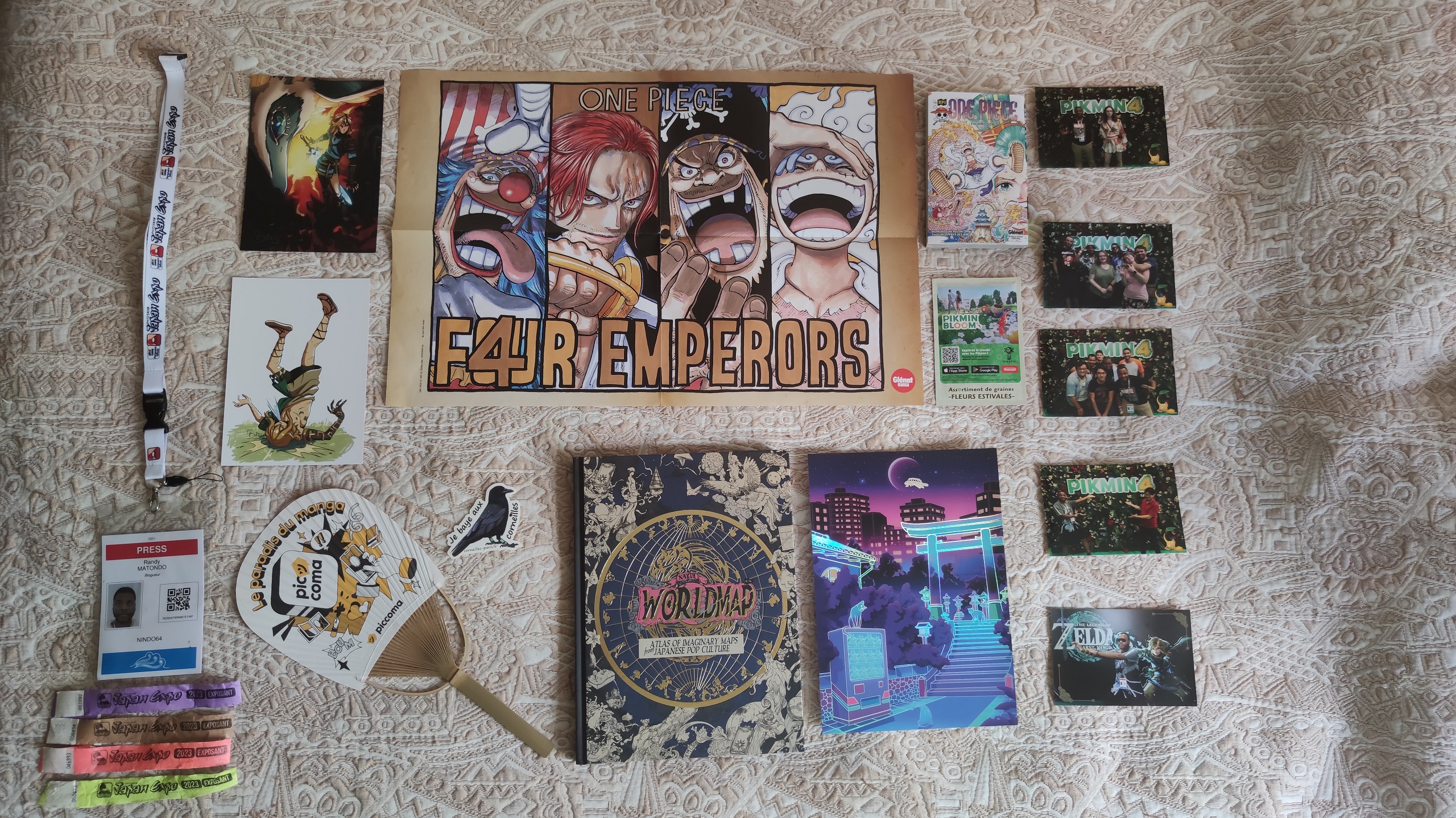 Avant de conclure, le déballage du loot traditionnel de JE. Avec des achats faits le jeudi pour la plupart. De loin, on peut déjà y voir les nombreuses photos faites au décor de Pikmin 4 avec des graines à planter. Et un éventail Piccoma distribué gratos dans les allées.