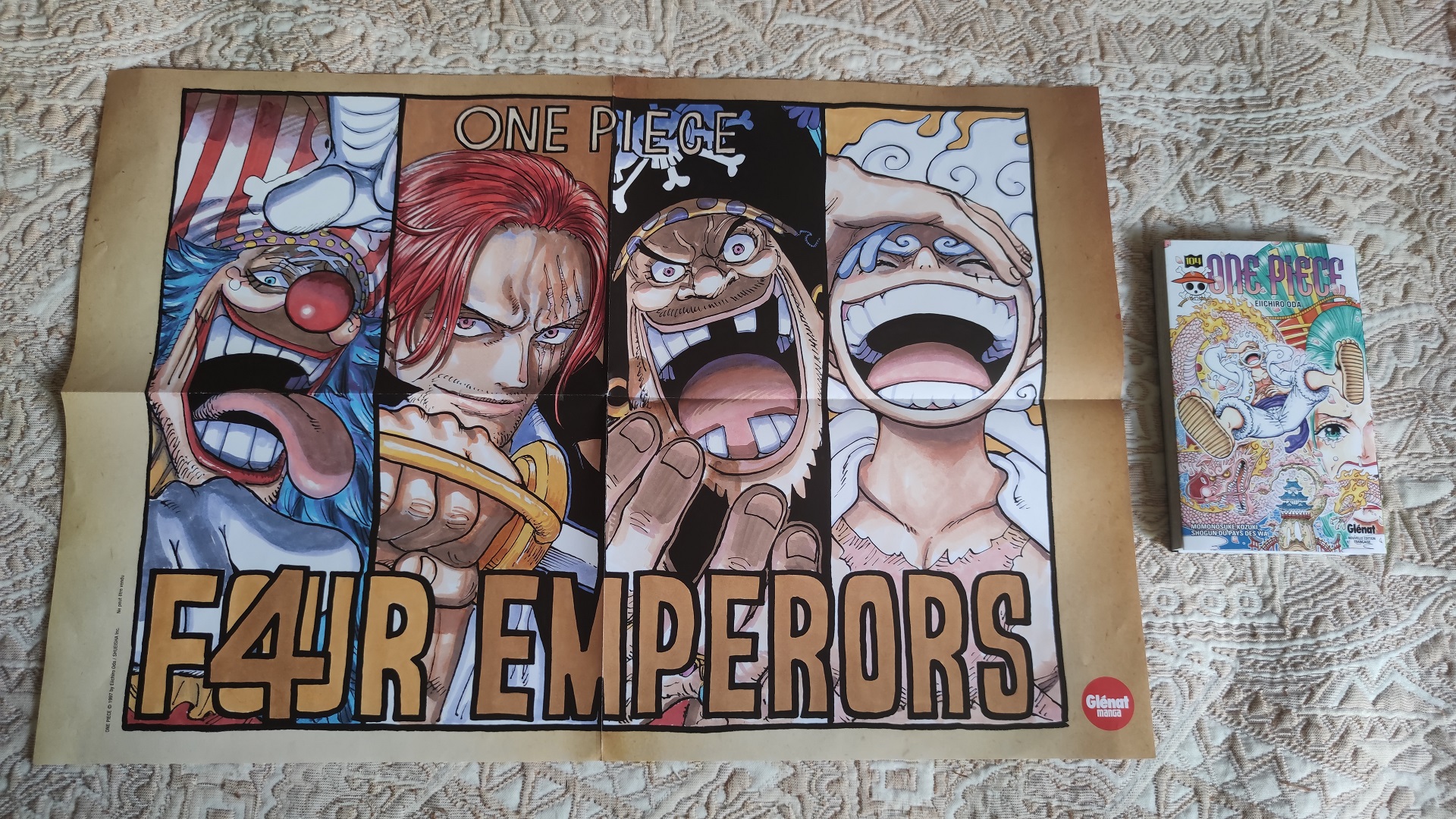 Un poster de One Piece offert sur le stand Glénat pour l’achat de n’importe quel tome du manga. Ici le volume 104.
