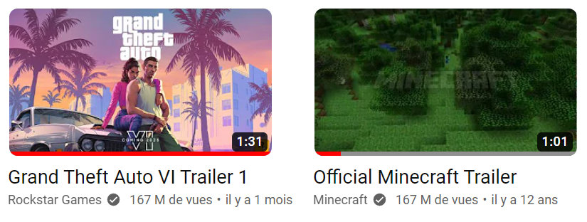 Vers mi-janvier, le premier trailer de GTA VI a rattrapé celui de Minecraft en termes de vues sur YouTube. L’élevant à 171 millions de vues au moment où cet article est publié. Même la bande-annonce du 5e volet plafonnant actuellement à 108 millions de vues, n’aura jamais réussi à rattraper les deux jeux précités. C’est donc à ce jour et sans doute pour très longtemps, la bande-annonce de jeux vidéo la plus regardée de tous les temps.