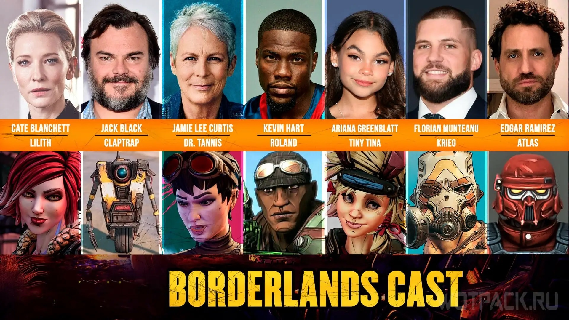 Dans les rôles principaux, on retrouve Cate Blanchett en Lilith. Kevin Hart en Roland. Jamie Lee Curtis en Dr Patricia Tannis. Jack Black qui double le robot Claptrap. Ariana Greenblatt en Tiny Tina. Florian Munteanu en Krieg. Et bien d’autres.