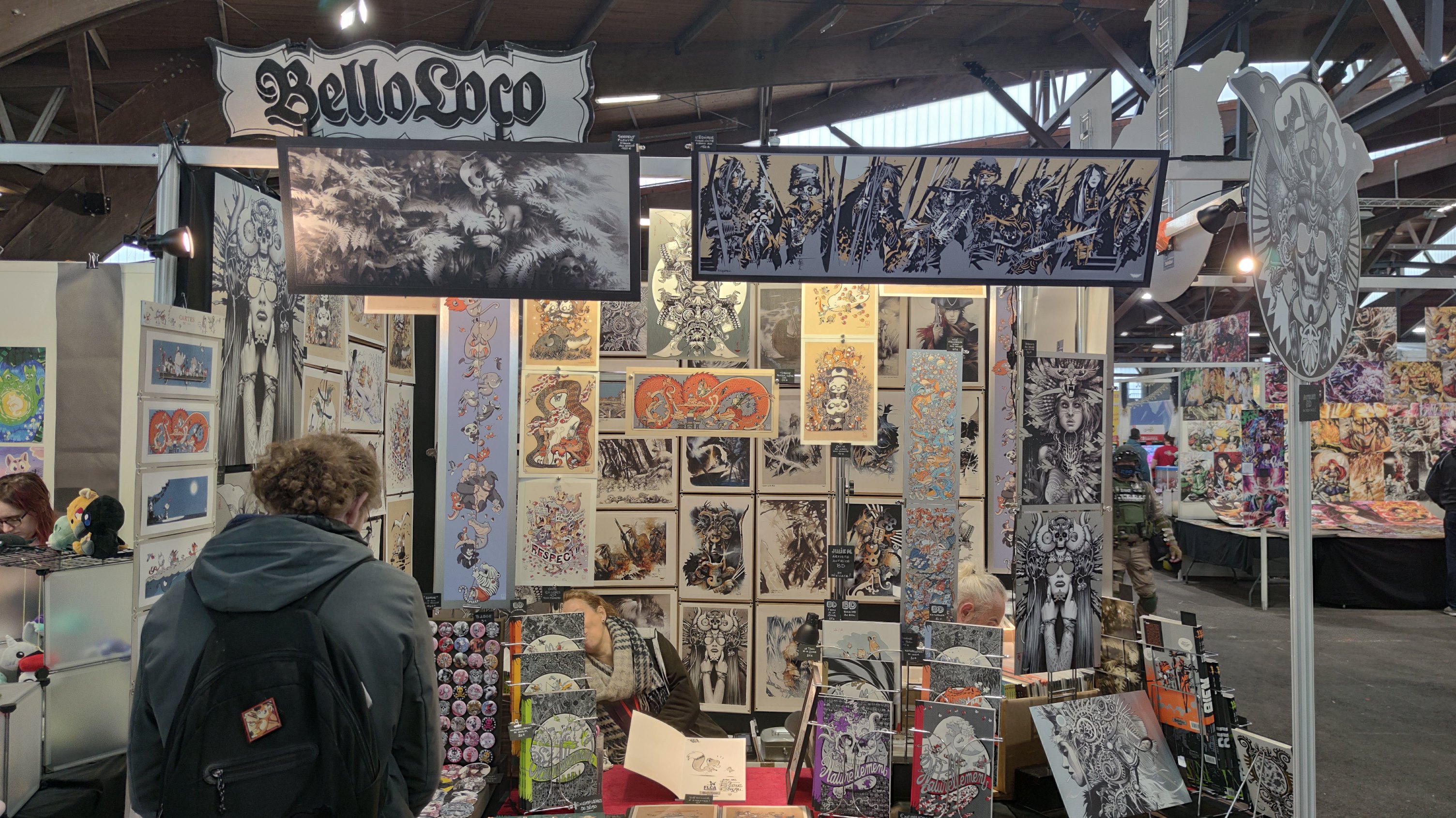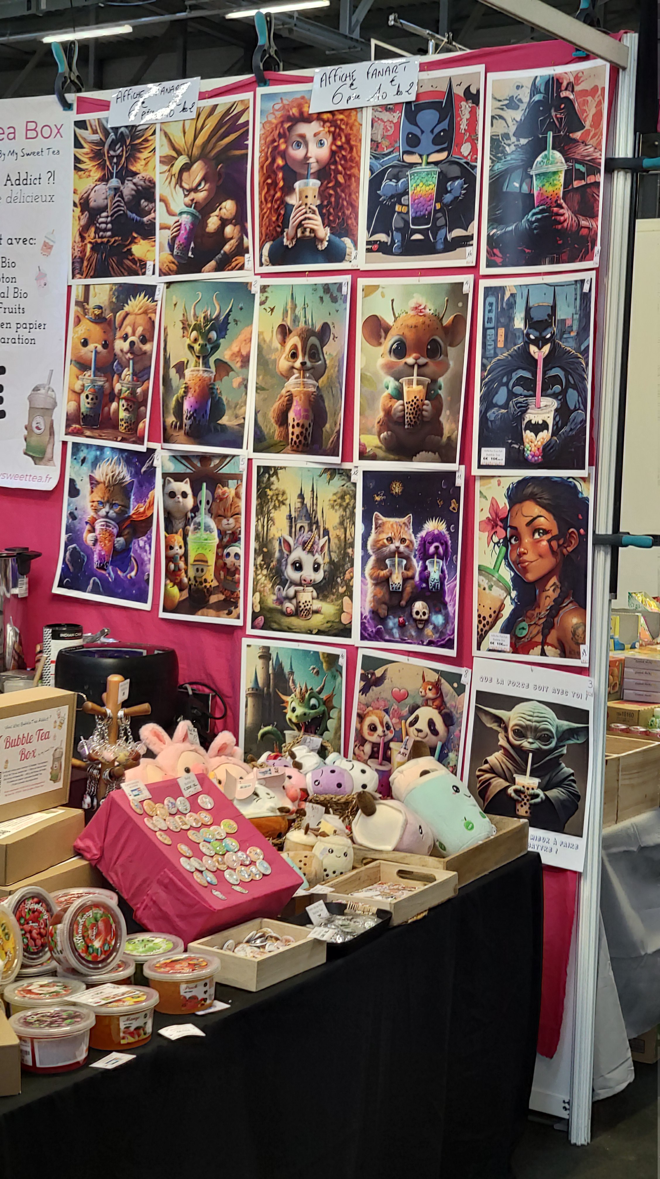 Et pour finir sur une note bien moins réjouissante, il y avait dans ce hall un stand qui vendait des posters et autres produits dérivés avec des images générées par Intelligence Artificielle. Dit autrement, des personnes se faisant de l’argent avec des images émulant le style de véritables artistes, et créés à base de mots-clés. Je trouve que c’est encore plus scandaleux que les dessins imprimés sur des posters et autres, sans l’accord de leurs auteurs, et sans qu’il soient crédités bien évidemment (n’est-ce pas Displate ?).