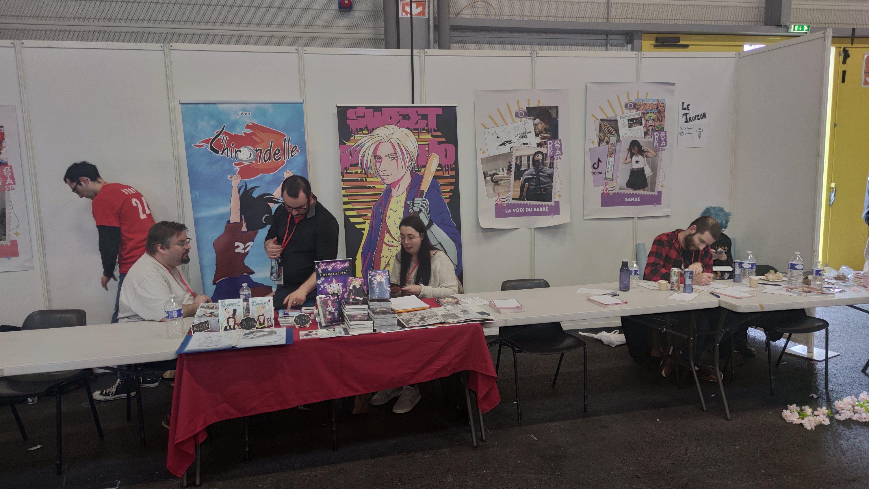 En parlant de lui, son stand de dédicaces était dans le même hall. Aux côtés de Wataru Akashingo, auteur du manga Mon père est la reine des Vtubeuses.