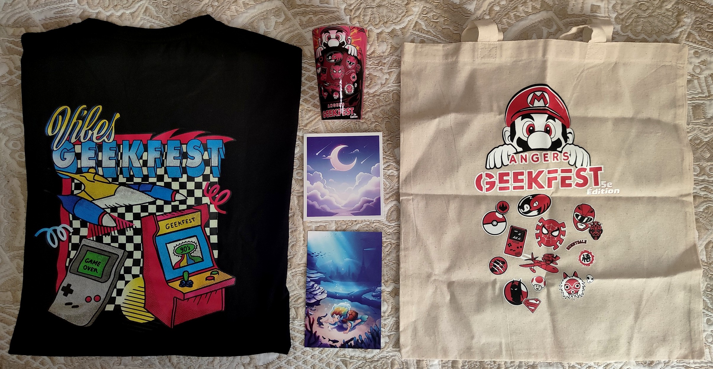 En termes de loot, deux illustrations de @volpipou. Un tshirt du Geekfest spécial années 90. Ainsi qu’un tote bag et un gobelet de cette édition.