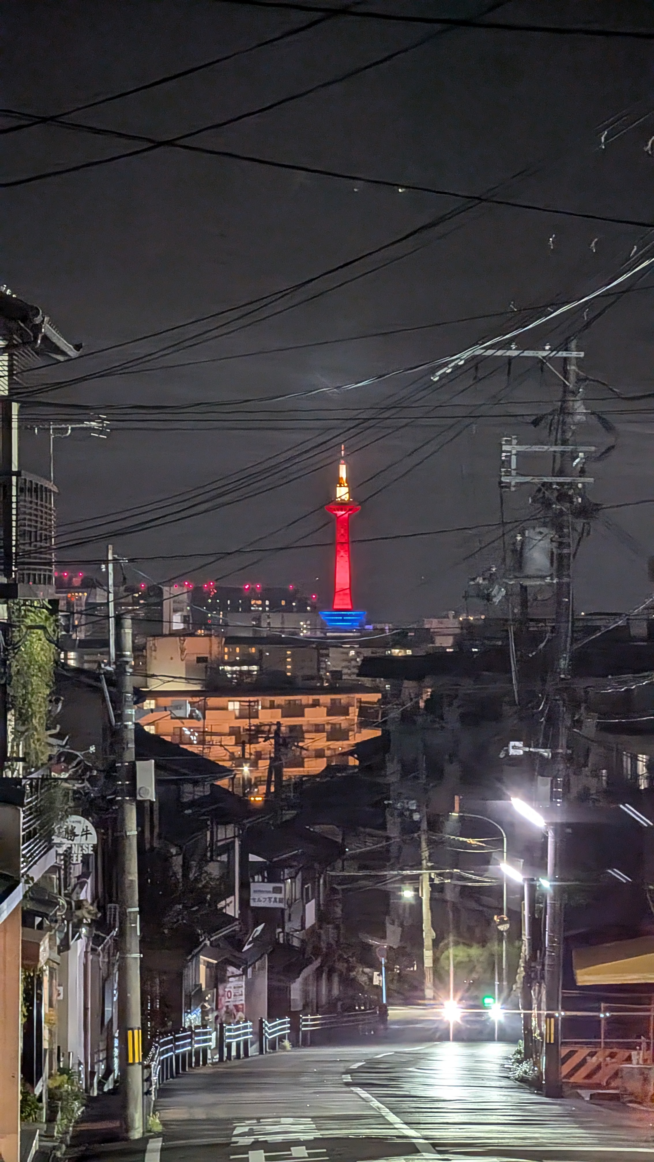 Sur le chemin du retour depuis les hauteurs, j’ai pu voir au loin la Tour de Kyoto s’illuminer d’un bleu et d’un rouge foudroyant.