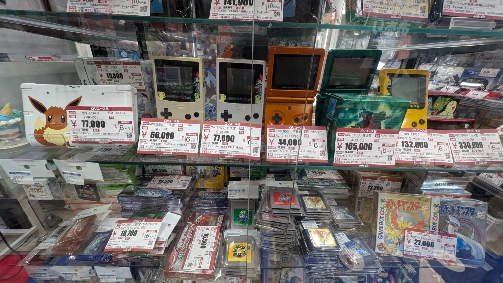 Et étonnamment, ce n’est pas la console la plus onéreuse. Puisque dans la même vitrine, la palme d’or revient à la Game Boy Micro Pikachu (tout à droite sur la photo) provenant aussi du Pokémon Center. Et pour la modique somme de 330 000 yens (2024€). On ne fera pas « mieux » que ça.