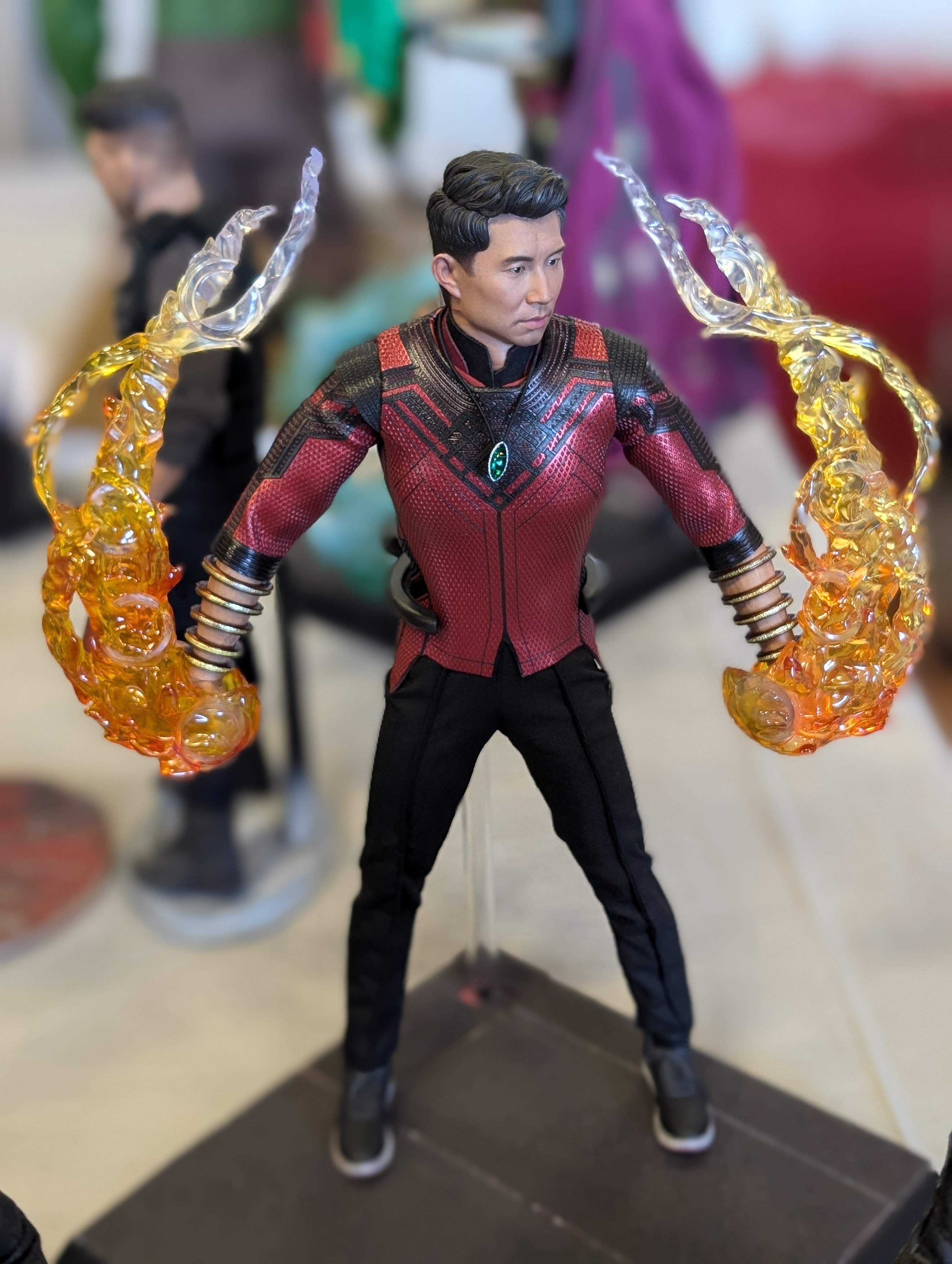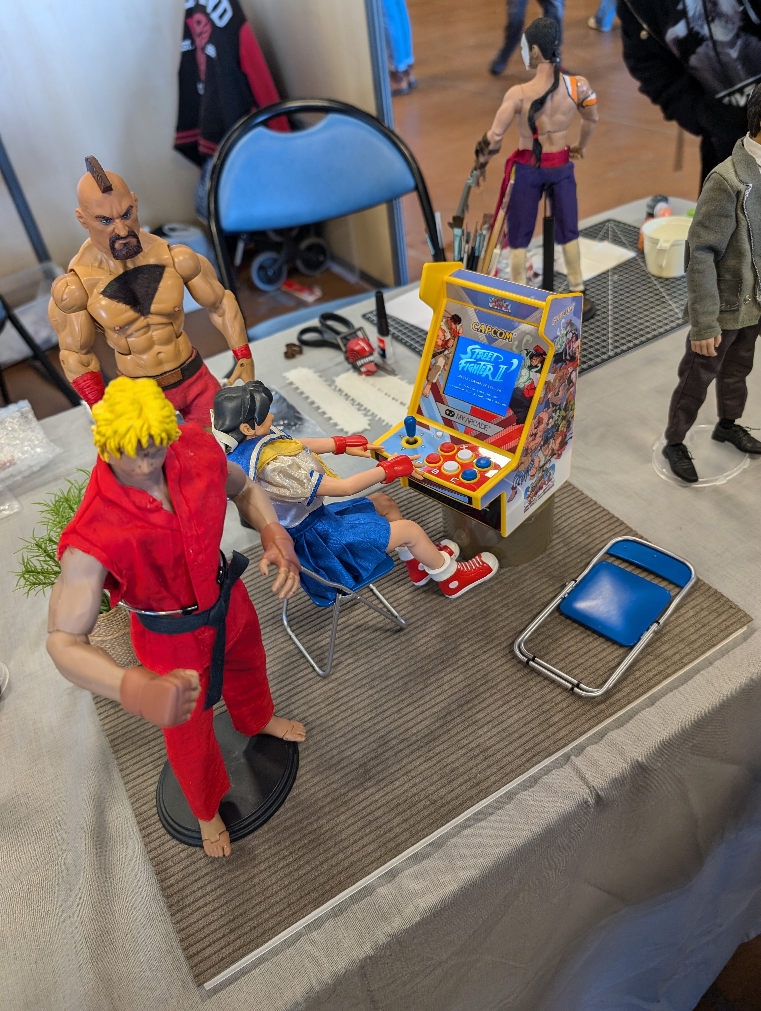 Une petite expo de figurines avec Shang-Chi, et des combattants de Street Fighter en train de jouer à leur propre jeu sur une mini-borne d’arcade.