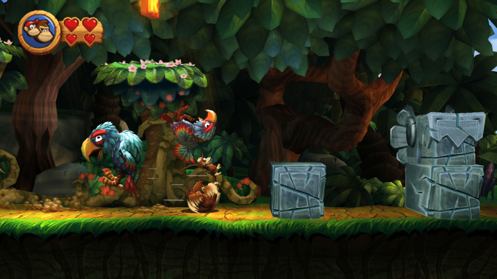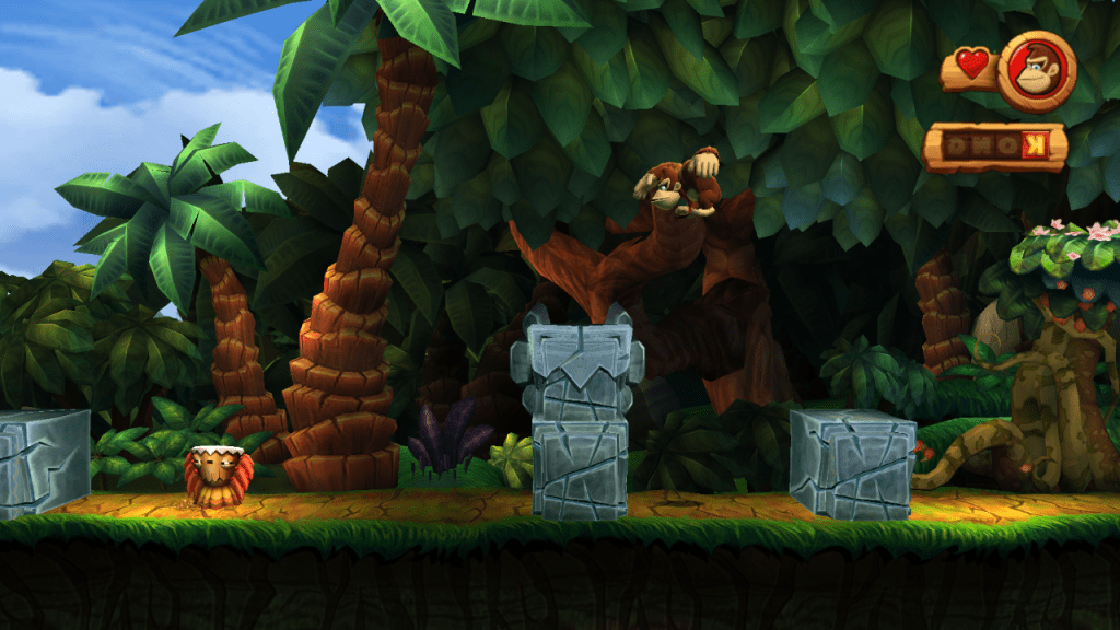 S’il y a bien une chose que l’on pouvait difficilement reprocher à Returns, c’était son gameplay dynamique et d’une efficacité redoutable. Bien que demandant une certaine maîtrise notamment pour la mécanique de rebond, et la gestion de l’inertie des personnages. On pouvait interagir avec l’environnement de manière plus varié comme en tambouriner le sol pour révéler des objets. Souffler pour activer divers mécanismes. S’accrocher à des parois en lierre pour accéder à des endroits autrement inaccessibles. Et etc.