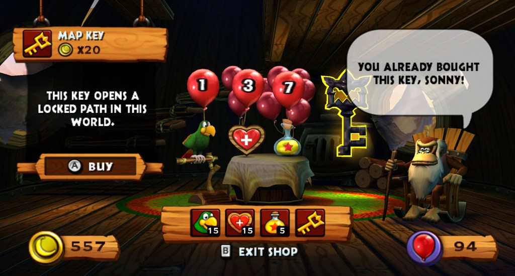 Hélas, Rambi fut le seul animal jouable dans cet opus. Même Squawks, que l’on pouvait contrôler autrefois en balançant des graines sur les ennemis, a été réduit au statut de commerçant avec Cranky Kong.