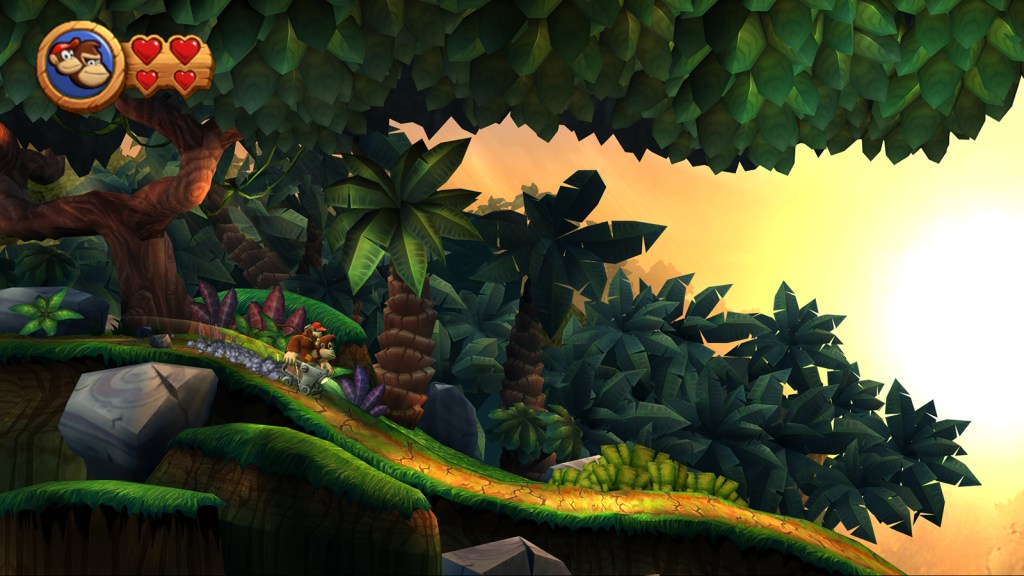 Un stage en particulier m’émerveilla dès les premières minutes de jeu. L’époustouflant Monde 1-4 que fut le Sunset Shore. Arborant un style « rétro » nettement inspiré des ombres chinoises. Où l’on voyait la silhouette des Kong sous un perpétuel soleil couchant, et faisant ressortir le rouge écarlate de leur cravate et casquette respectives. Intemporel.