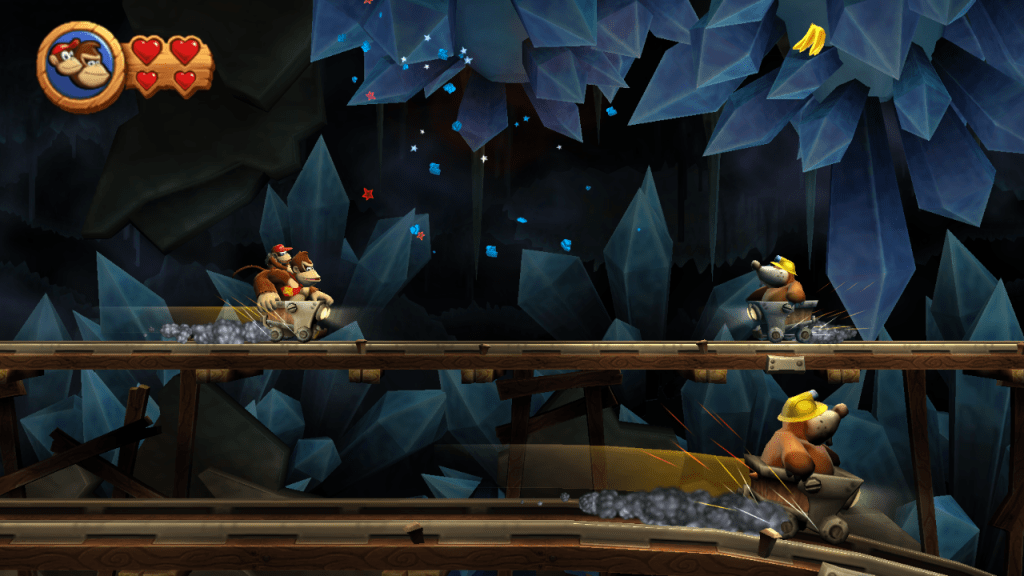 Bien que je n’avais jamais vraiment porté ces phases dans mon cœur sur SNES, Returns réintégra les niveaux en chariots miniers. Où la moindre erreur de saut ne pardonnait pas. Soit au sein d’un stage défilant horizontalement, soit lors d’un combat de boss pouvant se dérouler ainsi. Mais le plus étonnant, c’est que ces séquences n’étaient même pas les pires.