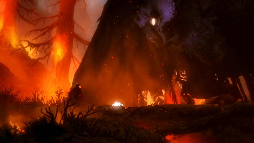 Après cette séquence haletante, Ori commença à planer en direction de l’arbre aux esprits pour parachever sa quête. Mais c’était sans compter la réapparition soudaine de Kuro qu’Ori croyait pourtant avoir semé. Bien décidé à l’empêcher d’aller plus loin en le faisant tomber violemment au sol. Une chute dont Ori ne semble pas pouvoir se relever. Le laissant à la merci d’un Kuro s’apprêtant à lui porter le coup de grâce.