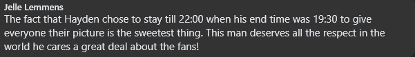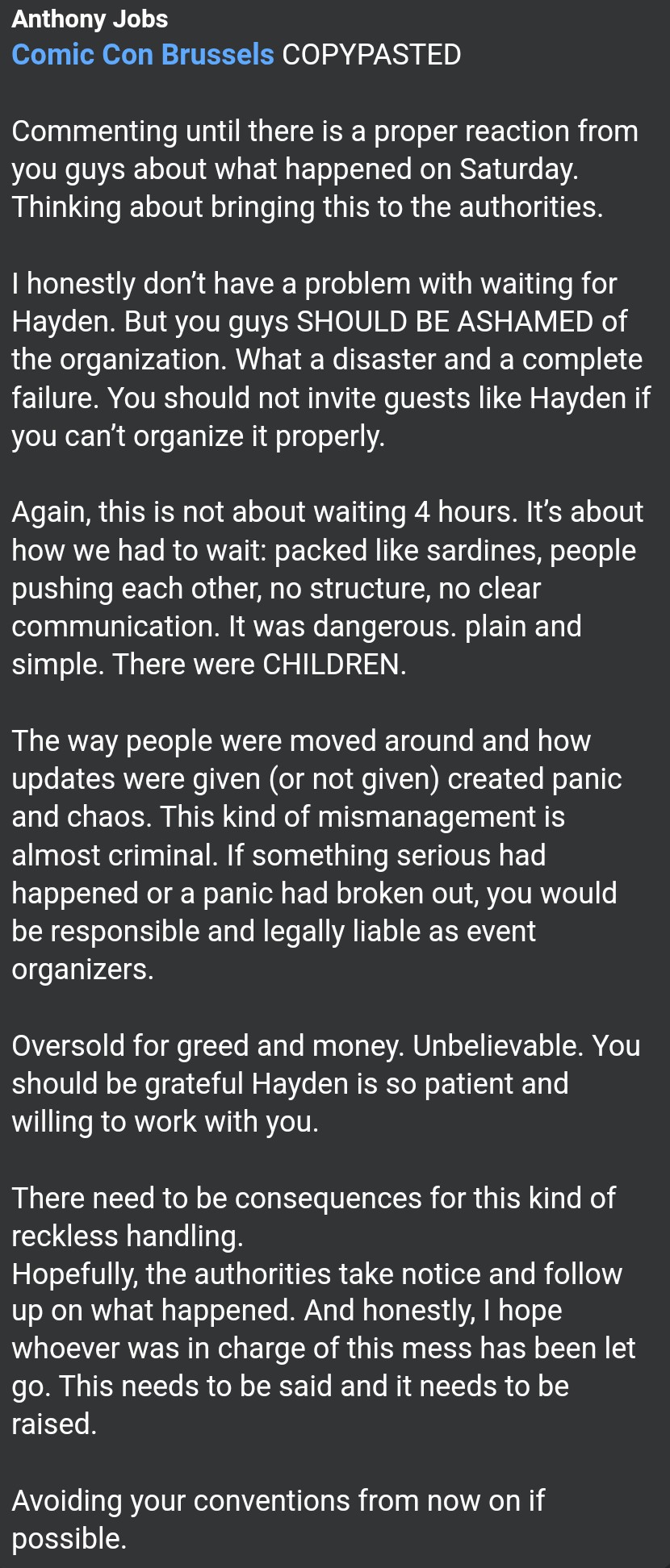 Me concernant, cela ne faisait pas partie de mes plans de voir Hayden à CCB. Et avec du recul, je suis bien content de ne pas avoir tenté le coup au vu des galères. Surtout quand je sais que deux de mes compères @vrtvingt et @songriku ont patienté plus de 3h entre le moment où ils ont pris place dans la file extérieure, et celui où ils ont pu rencontrer l’acteur à l’intérieur du hall. Et encore, ils n’ont pas attendu « longtemps » comparé à d’autres ou c’était carrément le double.
