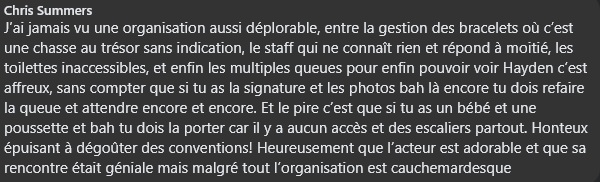 Et pour appuyer mes propos, j’ai mis ci-dessous quelques captures d’écran de commentaires en réponse à des publications de la page Facebook de CCB. Décrivant à quel point la situation était catastrophique. À tel point que l’acteur a choisi de rester jusqu’à 22h (au lieu de 19h30) pour que tout le monde ait sa photo. Respect à lui.