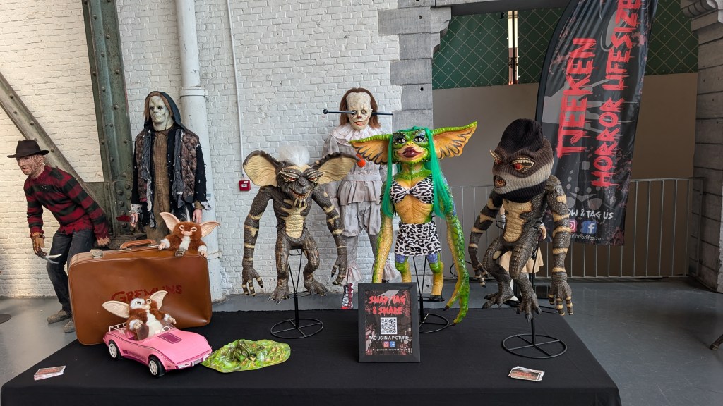 Le stand de @tjeekenhorrorlifesize avec des statues de films d’horreur et d’épouvante à taille réelle. Comme les Gremlins au premier plan, et un Pennywise pas du tout menaçant au fond.
