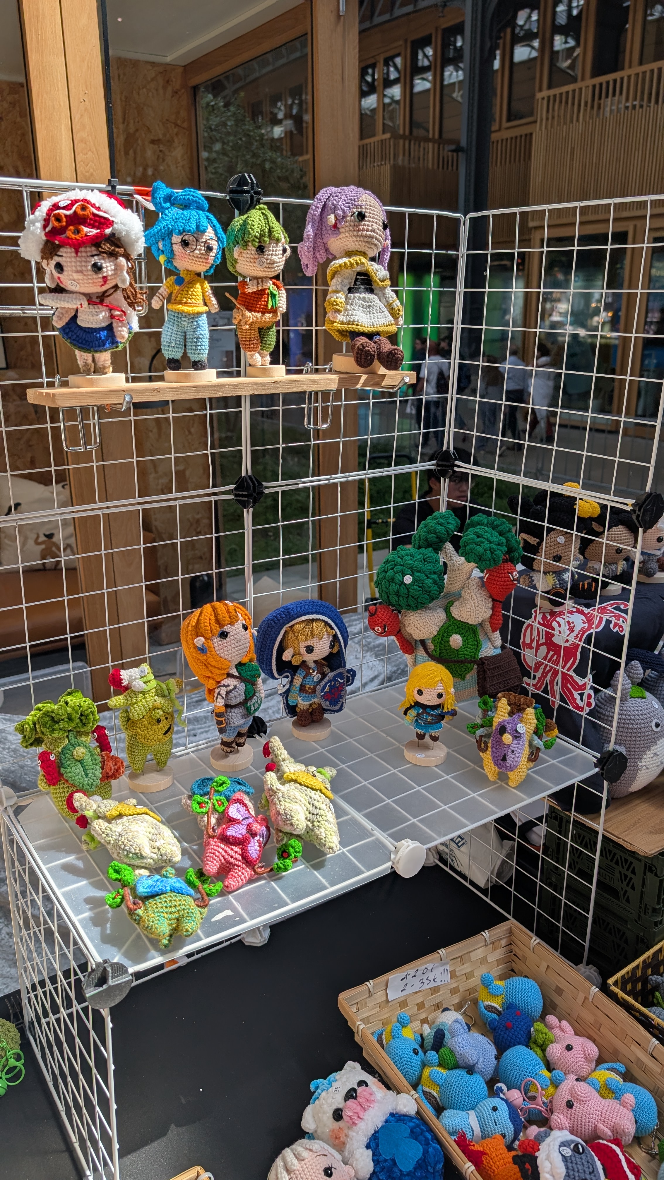 Le stand de @the_compendium_be avec leurs fioles, potions, et autres fantaisies. Et un autre avec des crochets de Link, de Korogus, et d’autres personnages.
