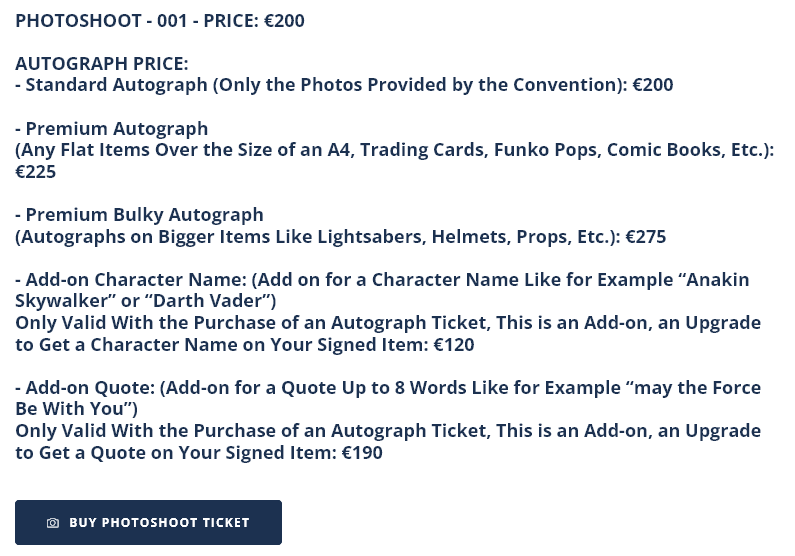 D’autant plus qu’il fallait raquer pour voir Hayden. Minimum 200€ pour la photo ou un autographe standard, et davantage si on veut ajouter des extras. Comme des dédicaces sur des objets, ou une citation du style « may the force be with you« . À ma connaissance, c’était l’acteur le plus cher que j’ai vu à une convention de ce type.