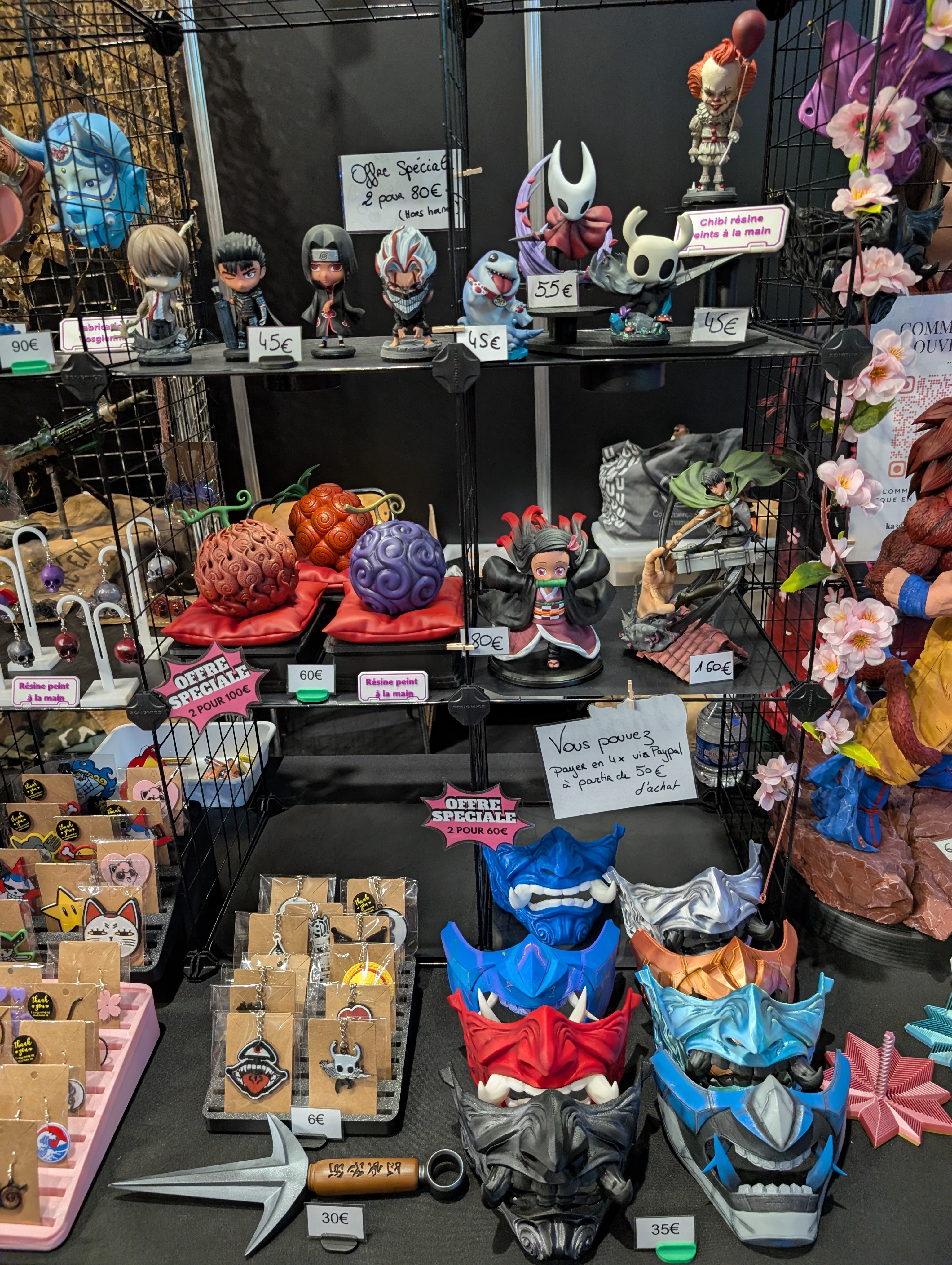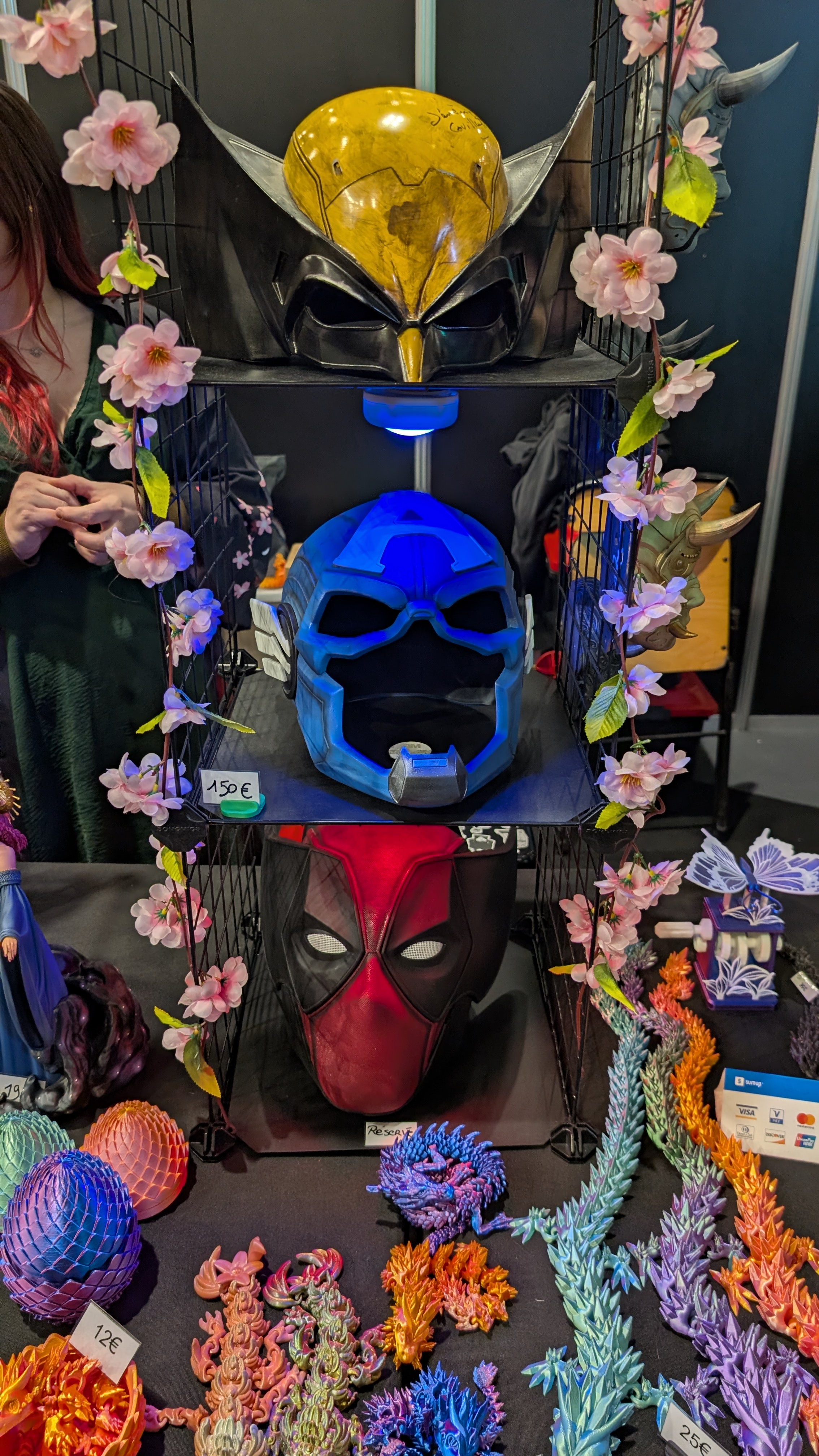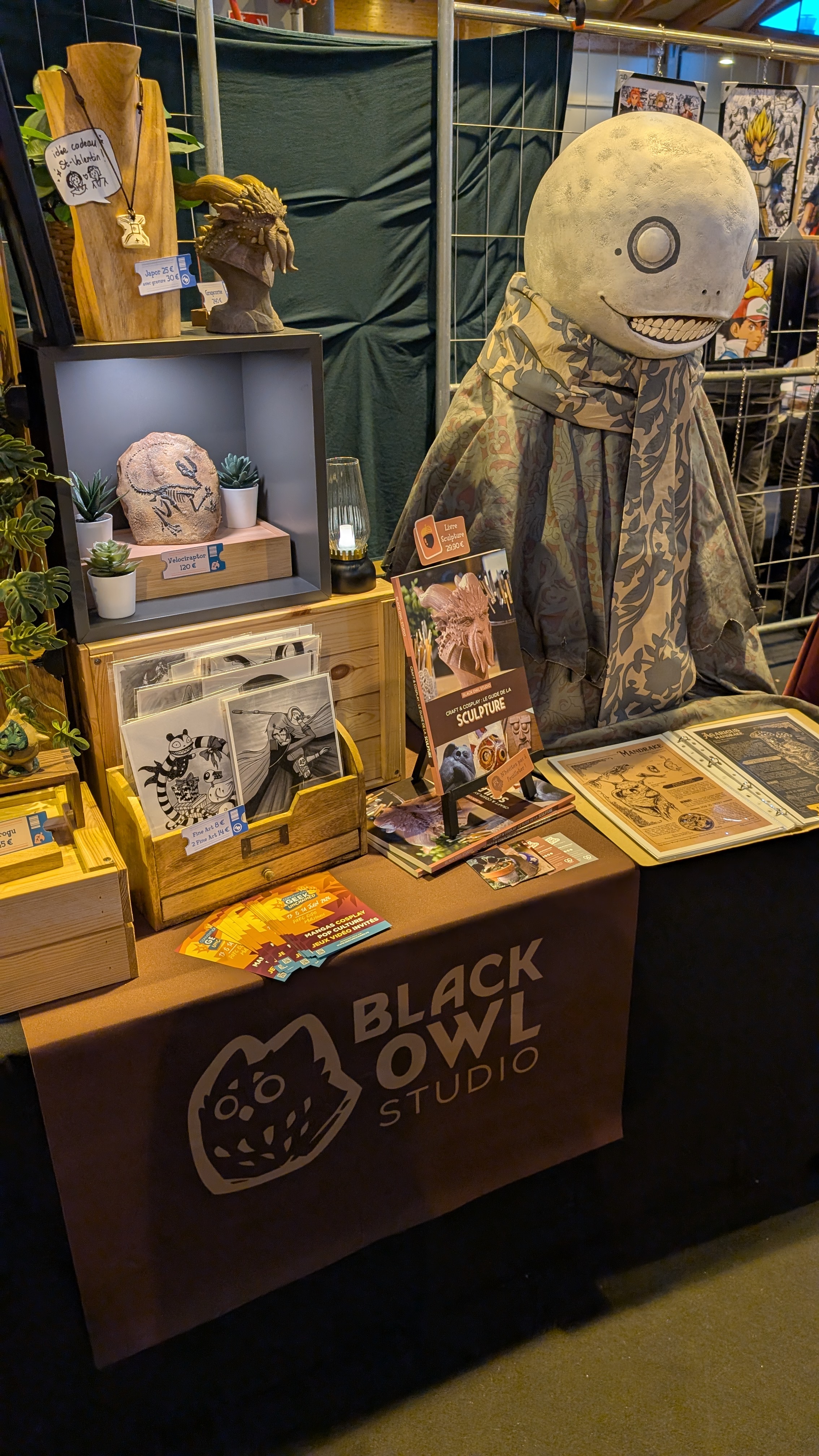 Les sculptures de @blackowlstudiocosplay avec le costume d’Emile de la saga de jeux NieR exposé sur son stand.
