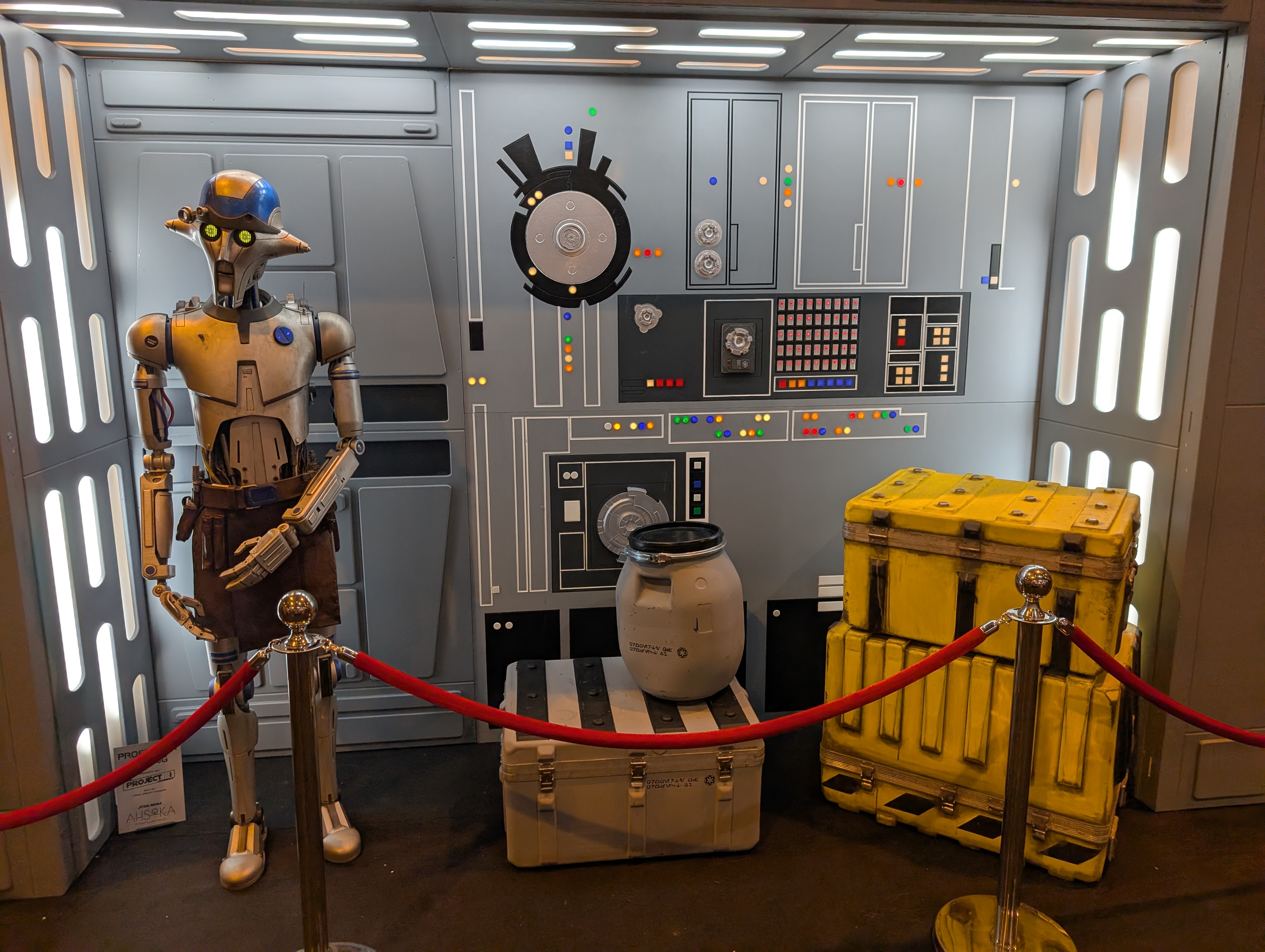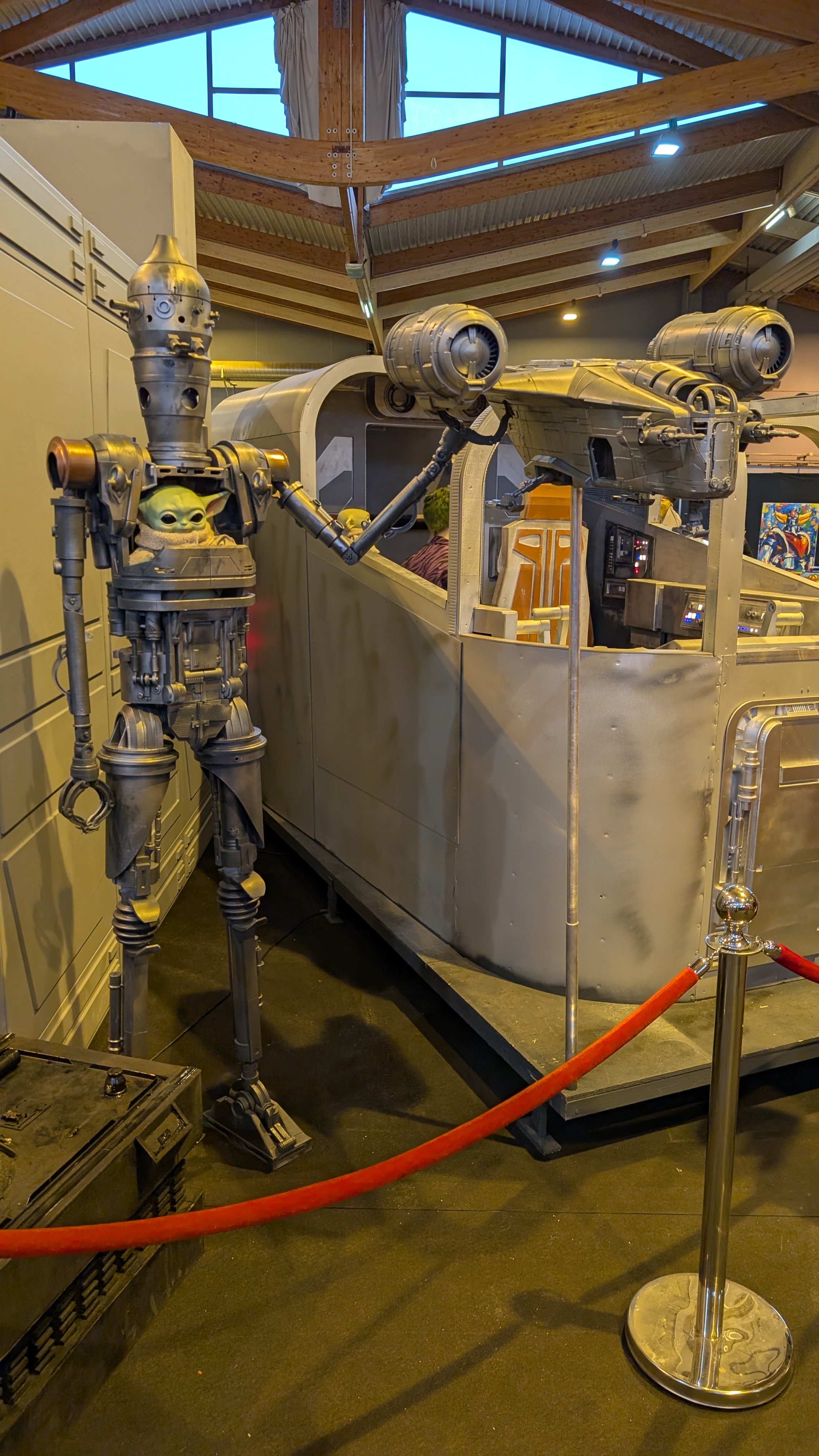 Le cockpit du Faucon Millénium de plus près. Et une statue du droïde IG-12 où sied Grogu.